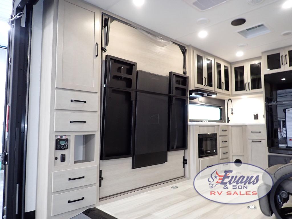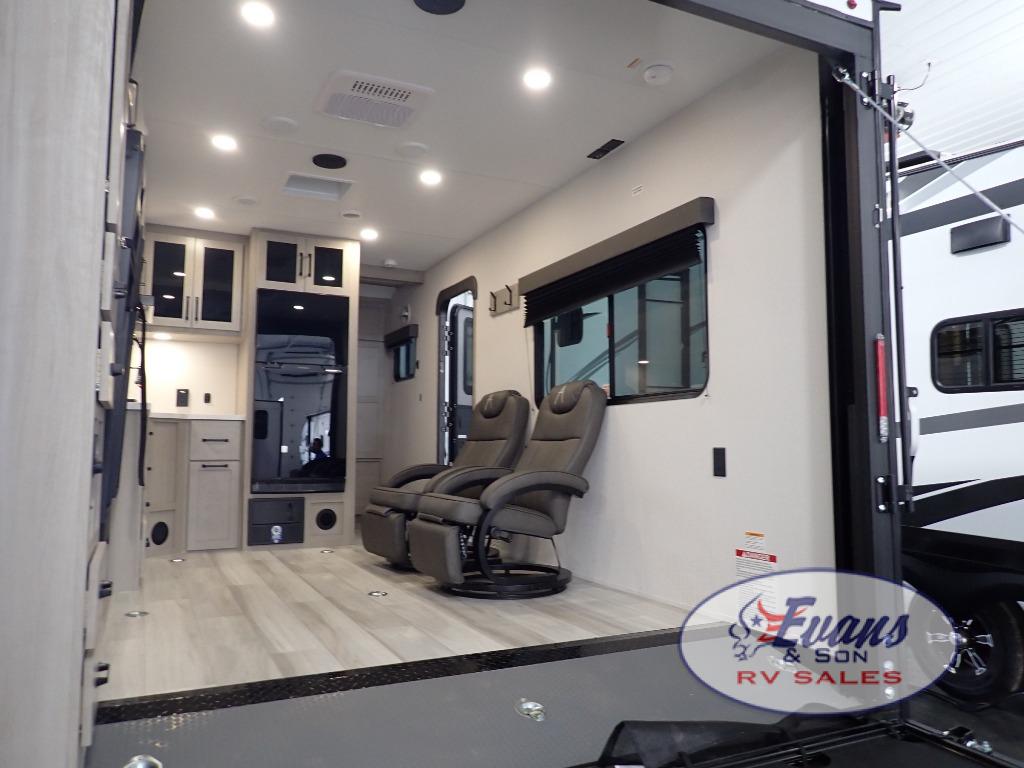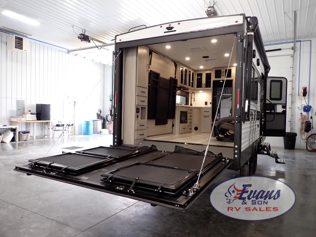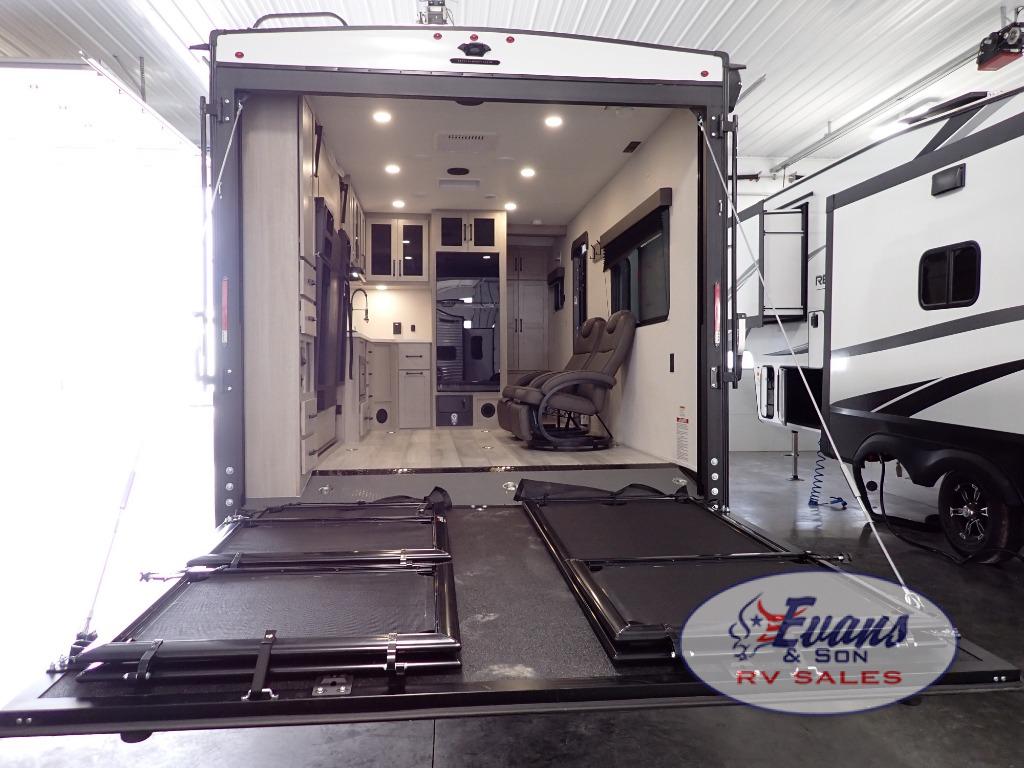 Get ready to take your adventures to the next level with this amazing toy Hauler. A spacious interior features a queen-sized murphy bed, perfect for relaxing after a long day of exploring. A convenient microwave and three-burner cooktop offer endless culinary possibilities, while a 12V 8cu. refrigerator keeps your essentials at the perfect temperature. Ample overhead cabinets provide additional storage for gear, cookware, and more. At the front of this toy hauler, a full bathroom with a closet provides a private retreat, and the ramp door/patio offers easy access to your toys and outdoor living space. Plus, a 13' awning offers shade and protection from the elements.