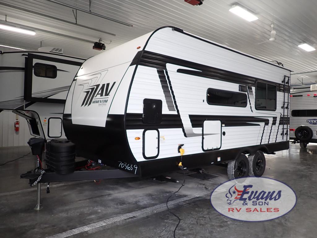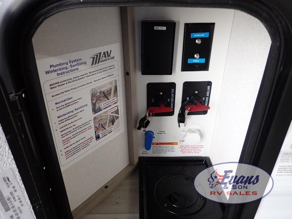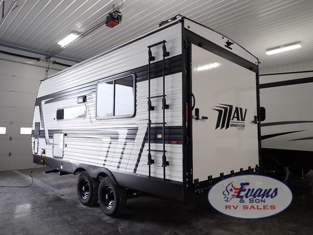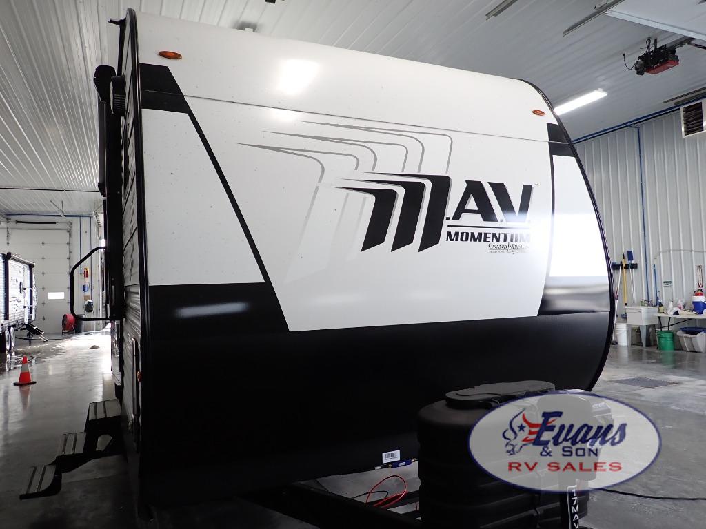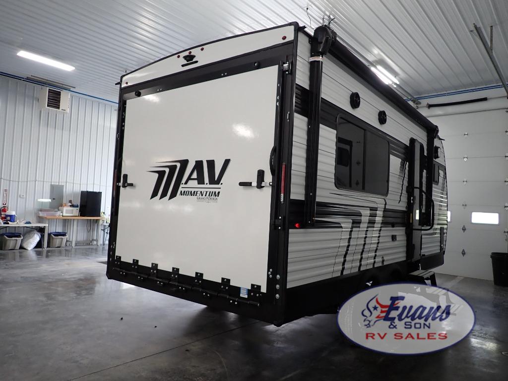 The Momentum MAV toy hauler travel trailers by Grand Design are designed to provide exactly what you need. The spacious garage provides tons of cargo space, with no wheel wells to get in the way. Additional storage includes magnetic storage door catches, and overhead consoles throughout. Conveniences like motion sensor lights and USB outlets will make your life easier, and you will be comfortable in all seasons with the 30K BTU furnace plus 15K BTU ducted air conditioning. The standard Solar Package comes with a 180W solar panel, a 40 Amp charge controller with Bluetooth, and a 12V refrigerator so you can go off-grid when the adventure calls for it.