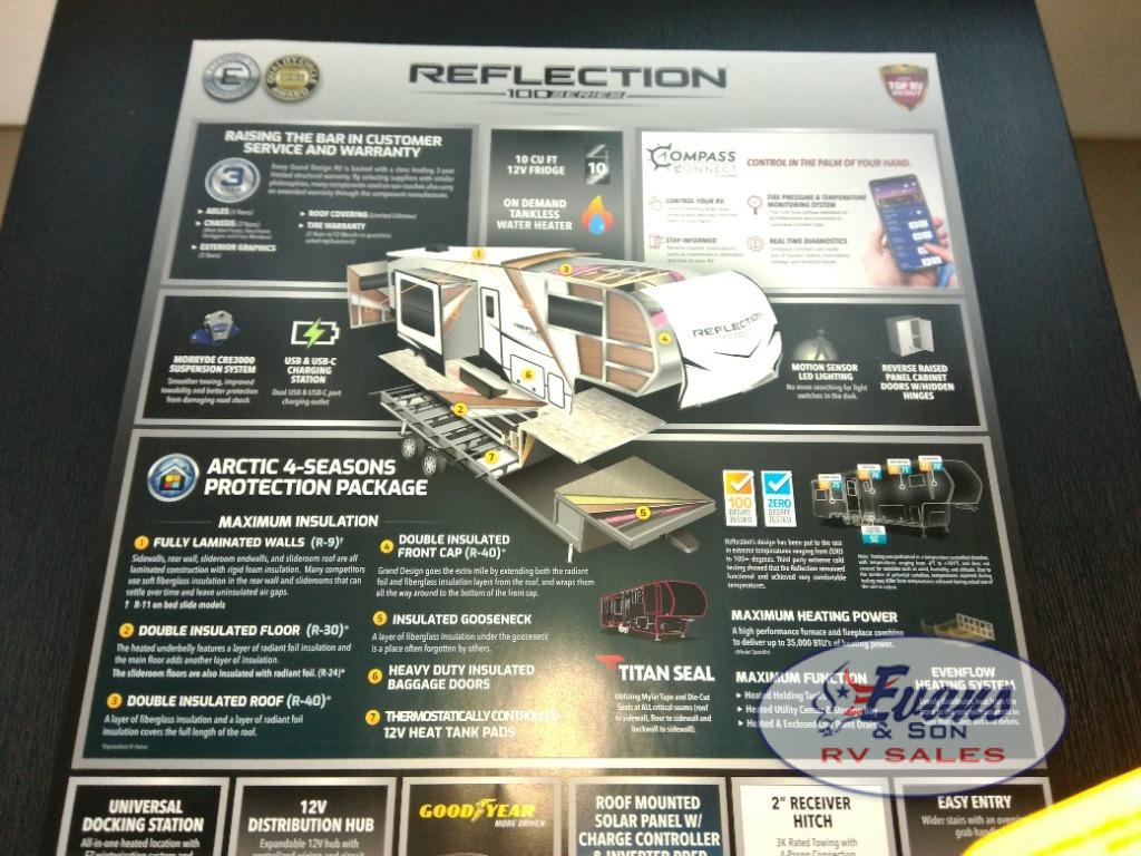 Each Reflection 100 Series fifth wheel by Grand Design is affordable and packed with luxury for unforgettable camping memories! The MorRyde CRE3000 suspension system and Goodyear Endurance tires will provide smooth towing from home to campground. And the solar package with a 180W solar panel, 60 Amp charge controller and 12V refrigerator will allow you to camp for longer periods of time and in more locations! A heated and enclosed underbelly with circulating heat is included in the Arctic 4-Seasons Protection Package, along with a double insulated roof and front cap, and thermofoil insulation under the holding tanks so you can camp all year long if you choose. You will appreciate having an on-demand water heater for hot showers after exploring, and the universal all-in-one docking station will let you monitor your RVs tanks levels and functions with ease. These models also include many luxurious interior features, such as premium Congoleum flooring, pleated shades, residential cabinetry, and matte black fixtures and hardware. Don't let the Reflection 100 Series fifth wheels pass you by!