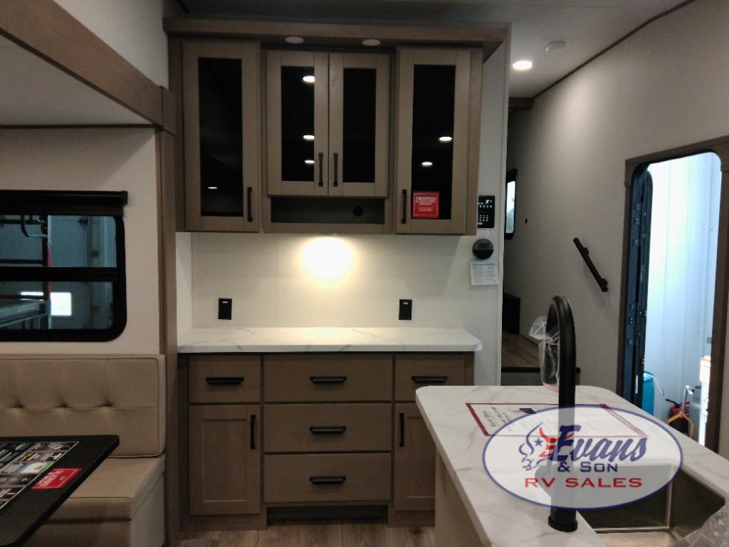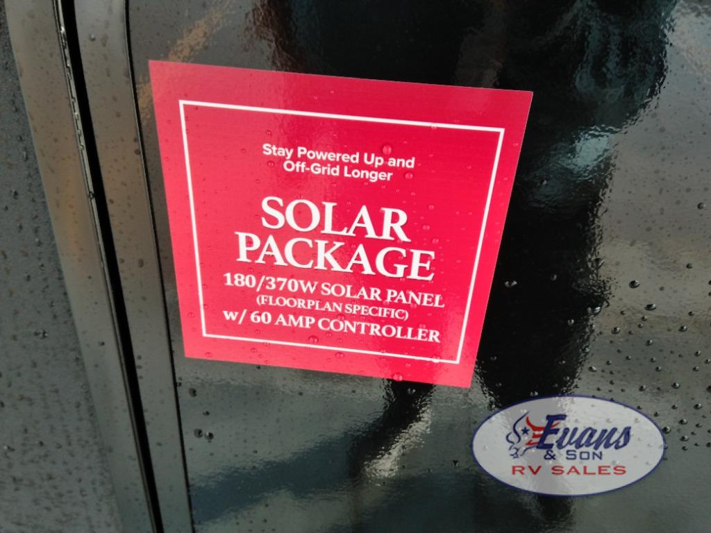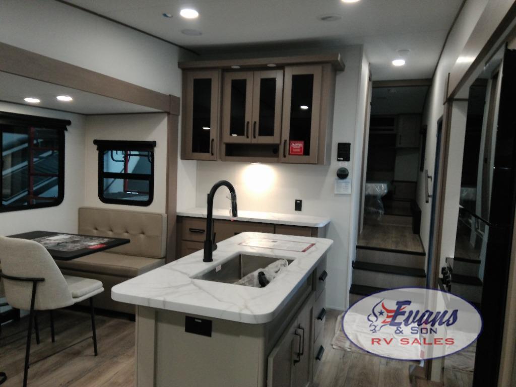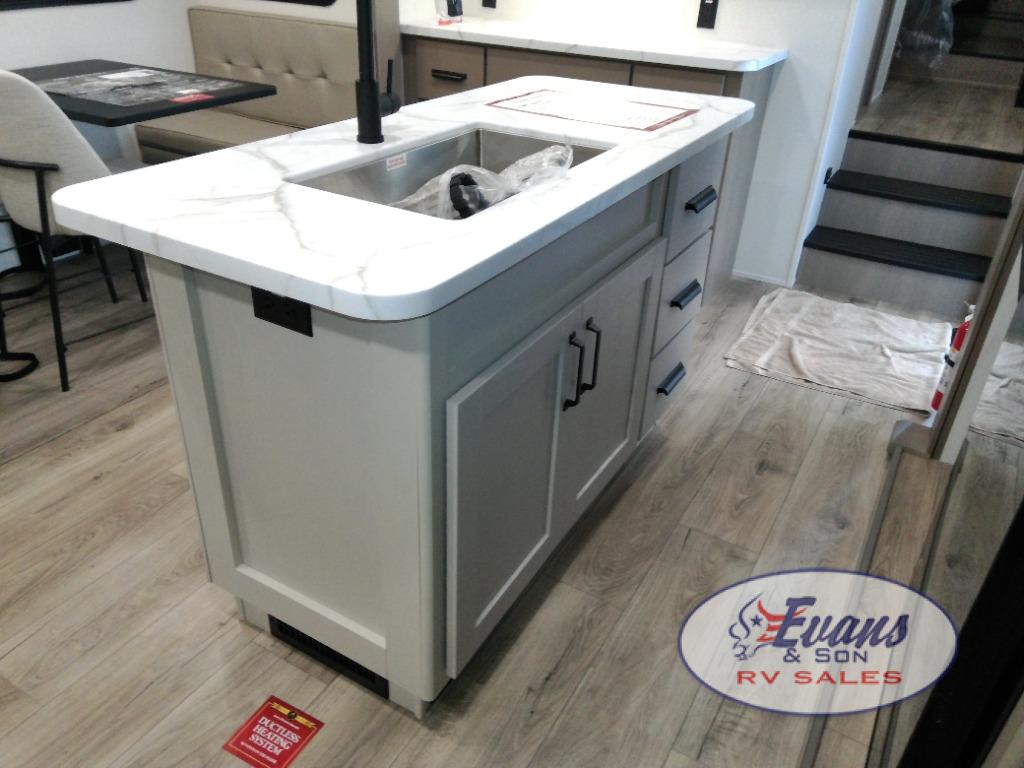 You'll love the amount of space you have in this fifth wheel thanks to the dual opposing slides in the rear living area/kitchen. Your friends and family can relax on the tri-fold sofa or theater seating across from the high-definition 40" LED TV. There is also a booth dinette or you can choose the optional swivel dinette if you prefer that seating. The chef of your group will appreciate having a kitchen island that will provide more counter space, plus there is a hutch with overhead cabinets for nice dishes. A full bath onboard lets you clean up each day and the front private bedroom includes a queen bed just like at home. You'll also love spending time outdoors under the electric awning, and there is an unobstructed pass-thru storage for fishing poles, hiking gear, and camp chairs!