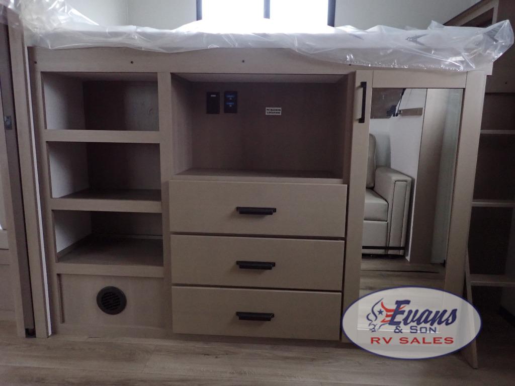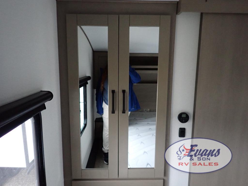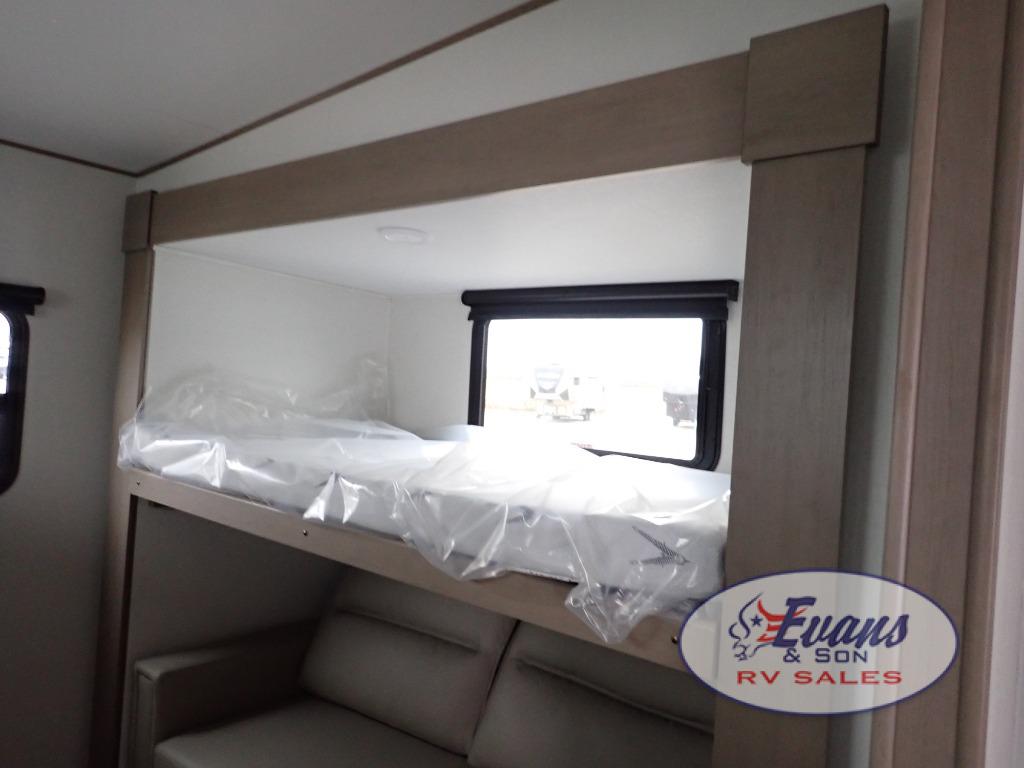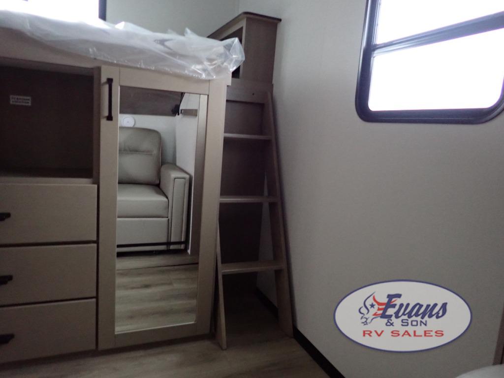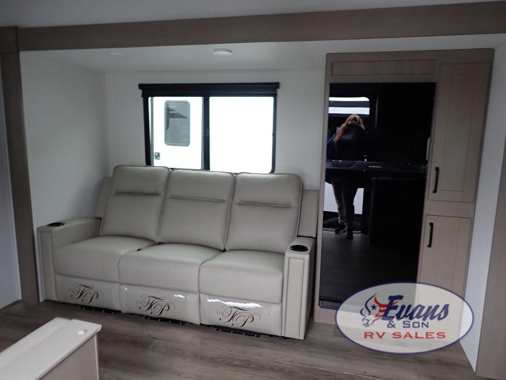 You will love this fifth wheel’s multiple sleeping spaces, such as the 36” flip top bunk offers flexible sleeping options for added capacity and comfort. A trundle bed provides an additional cozy sleeping space, ideal for guests or family members, and the 44” bunk bed with window features a comfortable sleeping area with natural light, ideal for kids or relaxation. Plus, the front bedroom boasts a queen bed, creating a peaceful retreat for rest and rejuvenation. In the living area, you will find a space that creates a warm and intimate spot for meals and conversation. The 40” TV delivers entertainment for relaxation and enjoyment, a theater seating provides immersive comfort for an exceptional viewing experience, and the well-appointed kitchen features a 10 cu ft refrigerator that ensures ample storage for fresh ingredients and beverages, a pantry, microwave, and a three-burner cooktop allows for versatile meal preparation. Finally, the full bathroom will complete the at-home experience, adding convenience to this model.