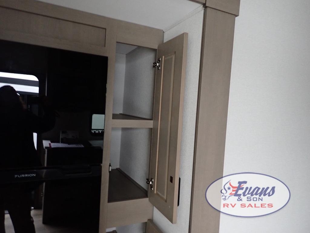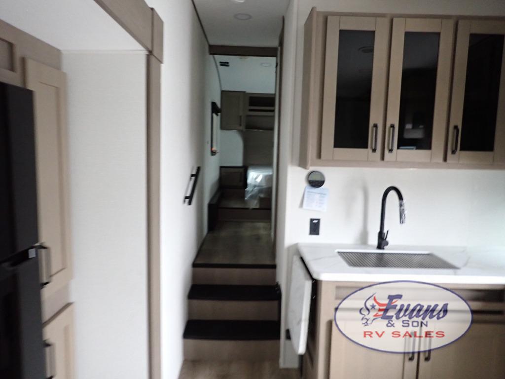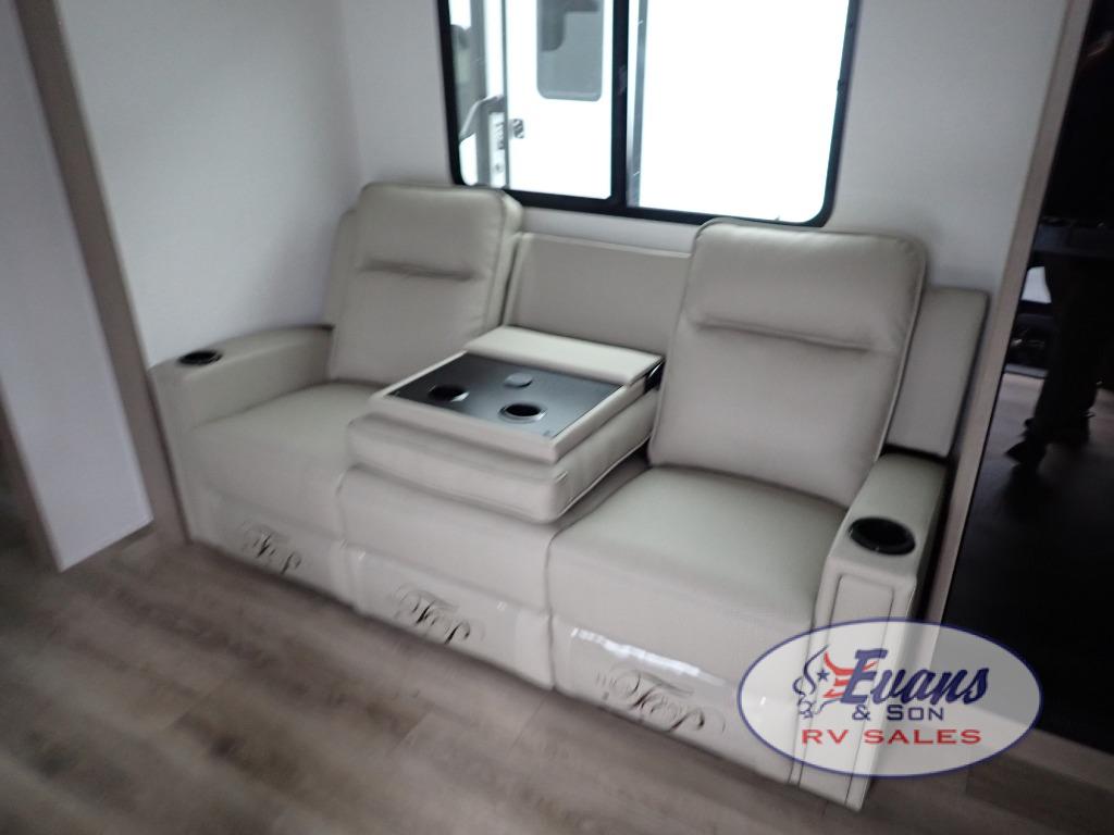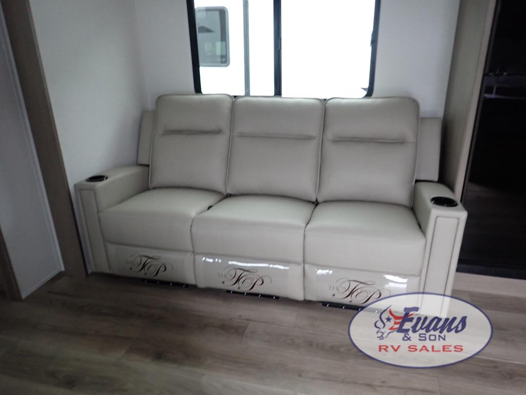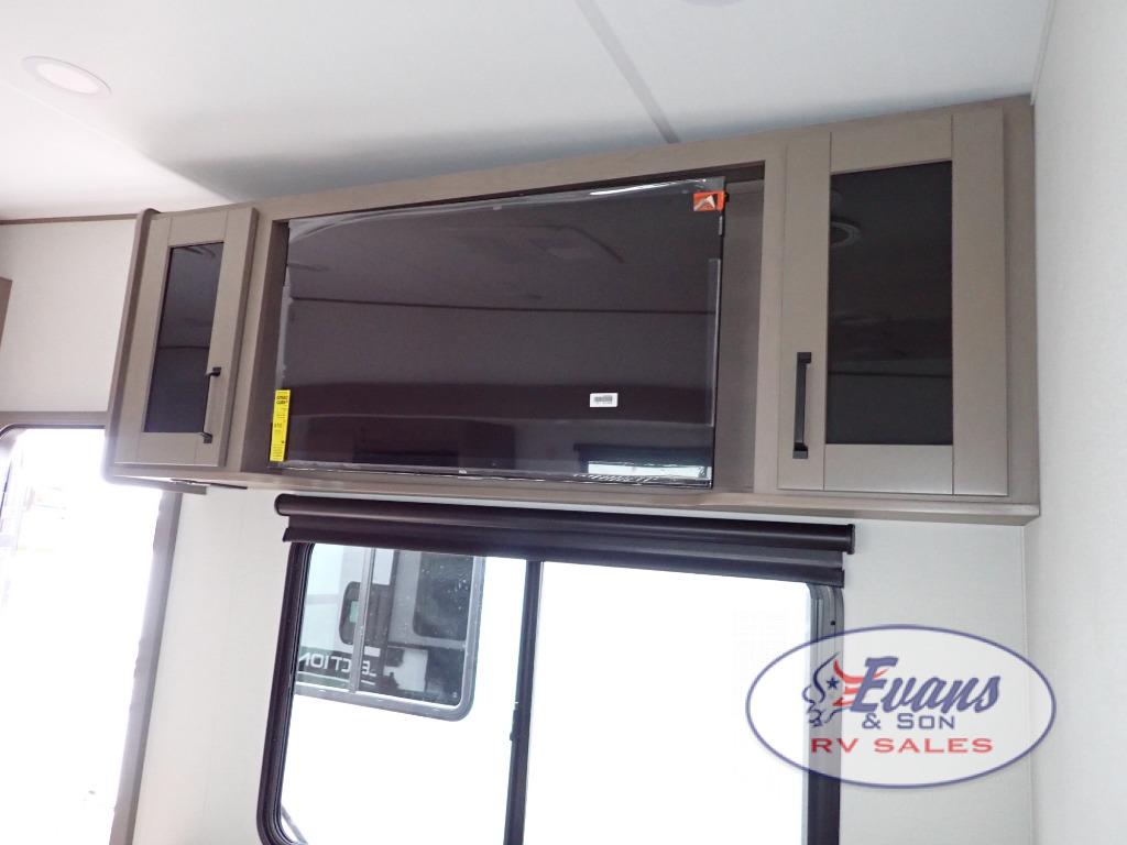 You will love this fifth wheel’s multiple sleeping spaces, such as the 36” flip top bunk offers flexible sleeping options for added capacity and comfort. A trundle bed provides an additional cozy sleeping space, ideal for guests or family members, and the 44” bunk bed with window features a comfortable sleeping area with natural light, ideal for kids or relaxation. Plus, the front bedroom boasts a queen bed, creating a peaceful retreat for rest and rejuvenation. In the living area, you will find a space that creates a warm and intimate spot for meals and conversation. The 40” TV delivers entertainment for relaxation and enjoyment, a theater seating provides immersive comfort for an exceptional viewing experience, and the well-appointed kitchen features a 10 cu ft refrigerator that ensures ample storage for fresh ingredients and beverages, a pantry, microwave, and a three-burner cooktop allows for versatile meal preparation. Finally, the full bathroom will complete the at-home experience, adding convenience to this model.