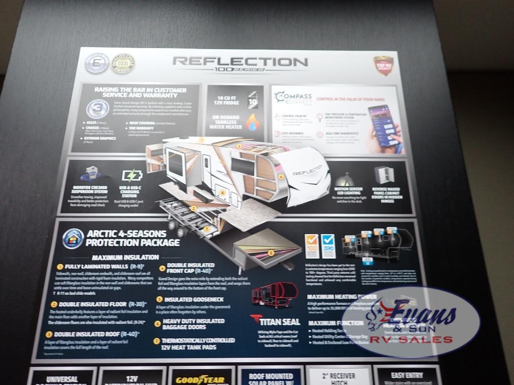 Each Reflection 100 Series fifth wheel by Grand Design is affordable and packed with luxury for unforgettable camping memories! The MorRyde CRE3000 suspension system and Goodyear Endurance tires will provide smooth towing from home to campground. And the solar package with a 180W solar panel, 60 Amp charge controller and 12V refrigerator will allow you to camp for longer periods of time and in more locations! A heated and enclosed underbelly with circulating heat is included in the Arctic 4-Seasons Protection Package, along with a double insulated roof and front cap, and thermofoil insulation under the holding tanks so you can camp all year long if you choose. You will appreciate having an on-demand water heater for hot showers after exploring, and the universal all-in-one docking station will let you monitor your RVs tanks levels and functions with ease. These models also include many luxurious interior features, such as premium Congoleum flooring, pleated shades, residential cabinetry, and matte black fixtures and hardware. Don't let the Reflection 100 Series fifth wheels pass you by!