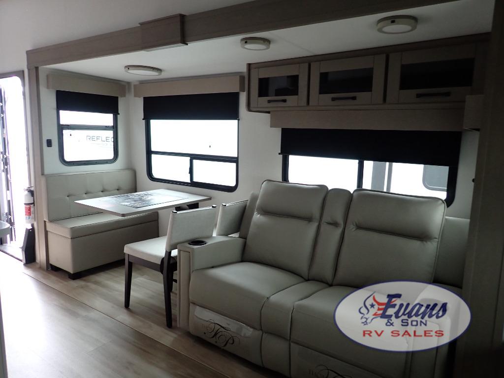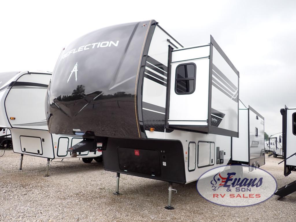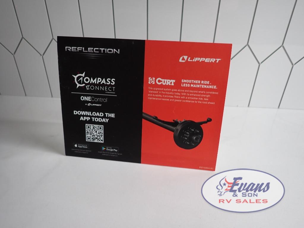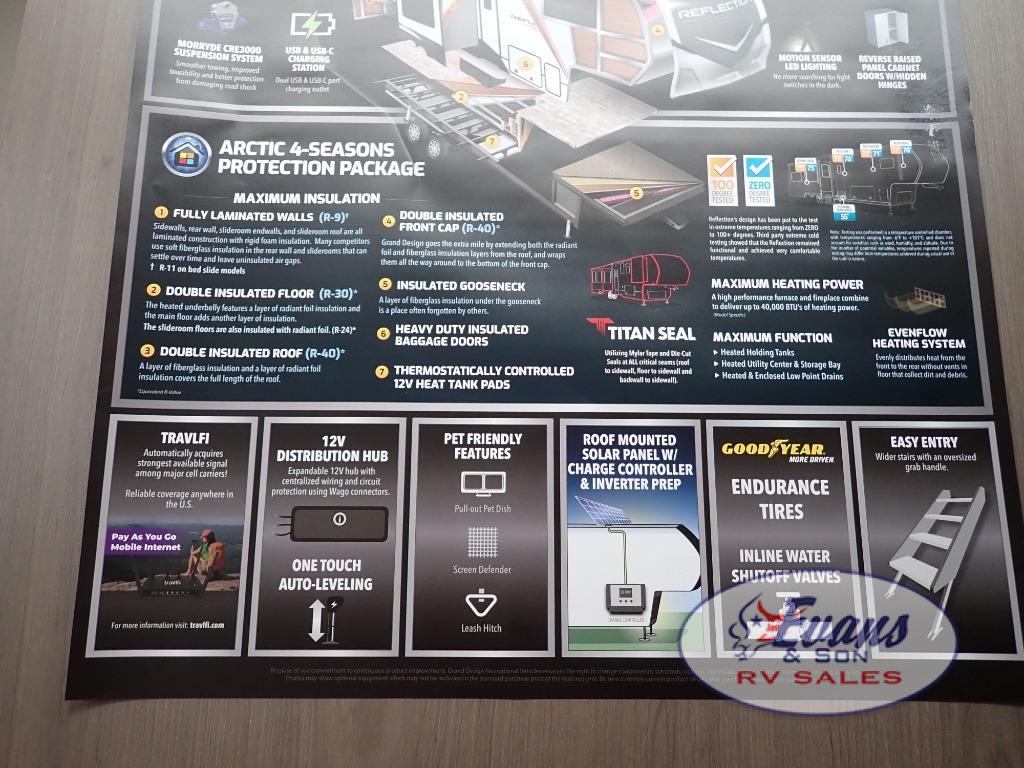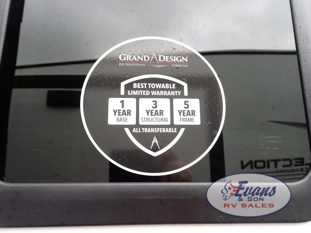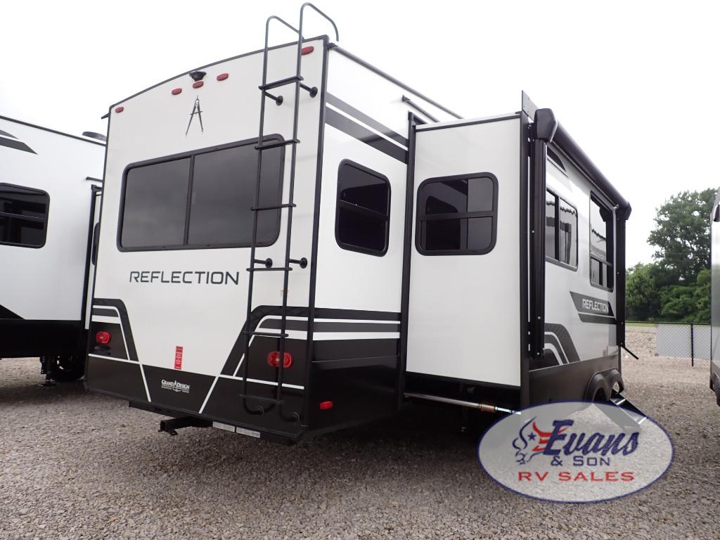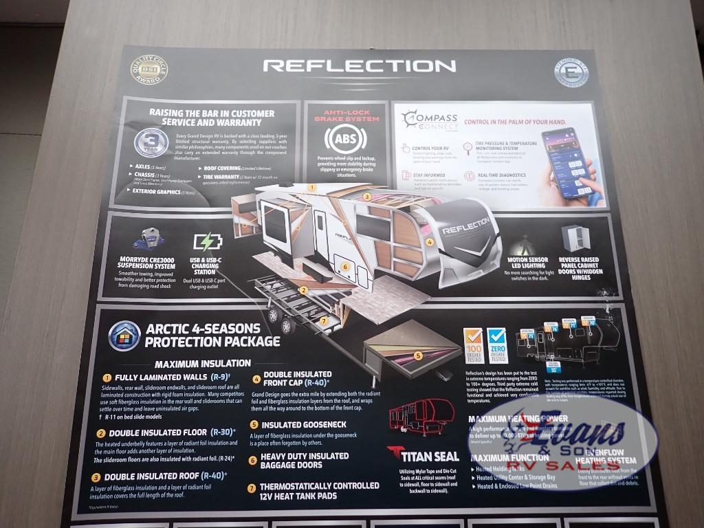 With any Reflection fifth wheel by Grand Design, you will have a solar panel for off-grid camping and a 60 amp charge controller and inverter prep, a Universal All-In-One docking station, unobstructed pass-through storage, and Goodyear Endurance tires. Each is constructed of gel coat exterior sidewalls, residential 5" truss rafters, walk-on roof decking, a fiberglass and radiant foil roof and front cap insulation plus laminated aluminum framed side walls, roof and end walls in slide rooms. Head inside to enjoy residential hardwood cabinet doors, premium Congoleum flooring, a spacious shower with a glass door, and many more comforts!