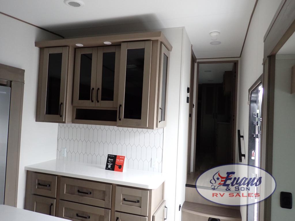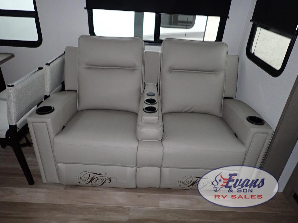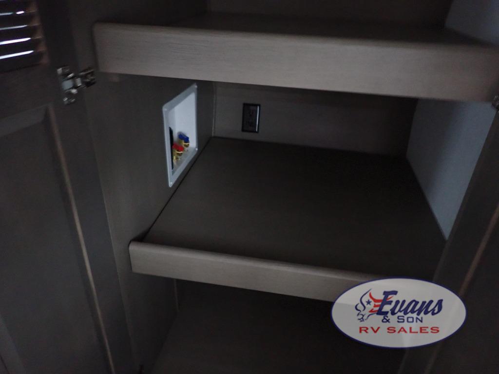 You can enjoy a spacious rear living area in this RV with dual opposing slides offering you entertainment, kitchen amenities, seating and windows for great views! The rear tri-fold sofa also converts into extra sleeping space for an extra guest or two, just like the booth dinette does. Yet you might like to add the swivel dinette option. There are theater seats to enjoy while you place your drinks in the cupholders and watch the entertainment center with a 40" LED HDTV and fireplace. The pantry is big enough to store your favorite snacks, and the kitchen island will make meal prepping easier, plus there is a 16 cu. ft. refrigerator to store any leftovers. The full bathroom has a 30" x 48" fiberglass shower and a linen closet to store your towels. The front private bedroom has a comfortable queen bed slide that can be switched out for the optional king bed, a dresser with overhead cabinets, and a full wall wardrobe that is prepped to add the optional washer and dryer so that you can extend your camping trip with clean clothes!