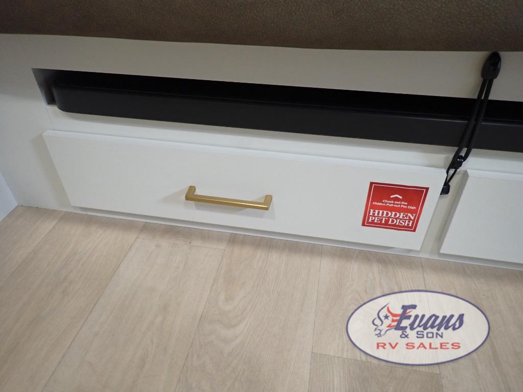 Travel in this 131DL model and step inside through the sturdy aluminum entry steps and you'll be greeted by a versatile 60" x 80" Murphy bed that doubles as a comfortable seating area during the day—perfect for relaxing with your furry companion, thanks to the included pet dish. In the center, the kitchen offers all the essentials for preparing a delicious meal, featuring a microwave, 2-burner range, 3.3 cu. ft. refrigerator, and overhead cabinets for added storage. At the rear, enjoy the convenience of a full bathroom complete with a walk-in shower and foot-flush toilet, making life on the road both comfortable and functional.