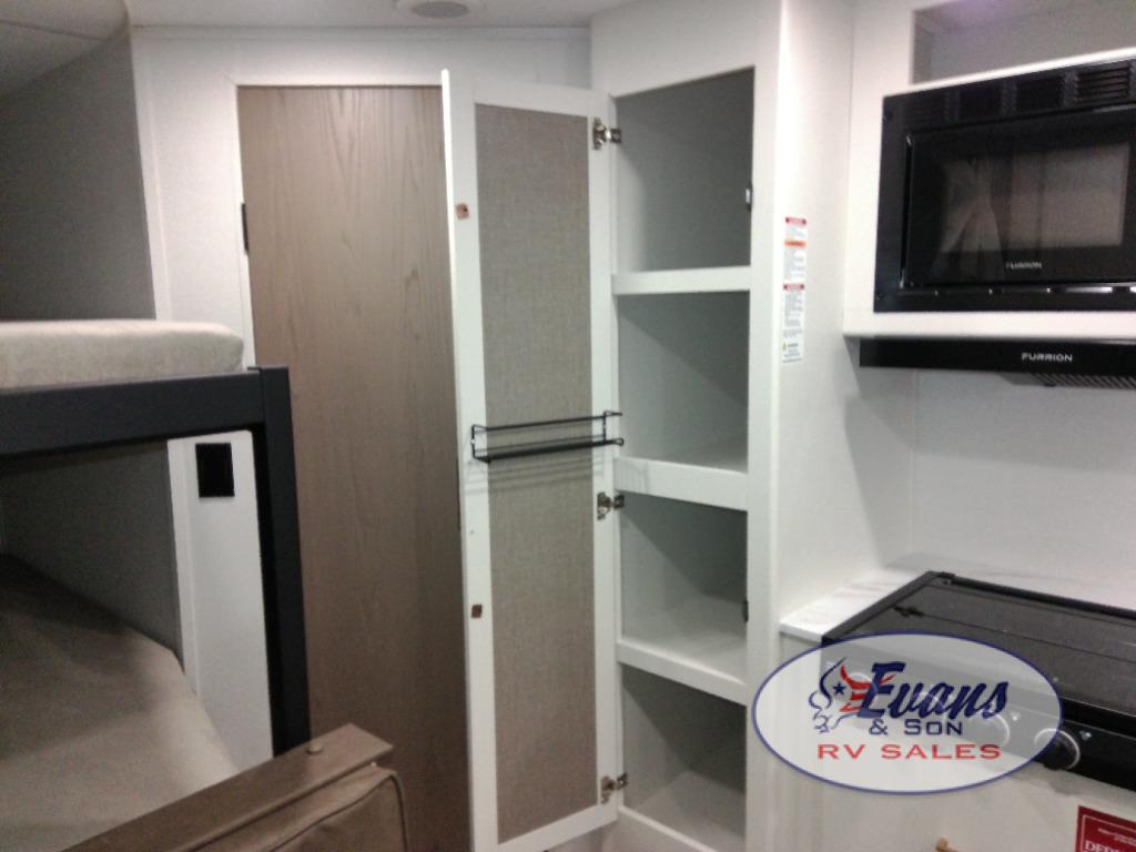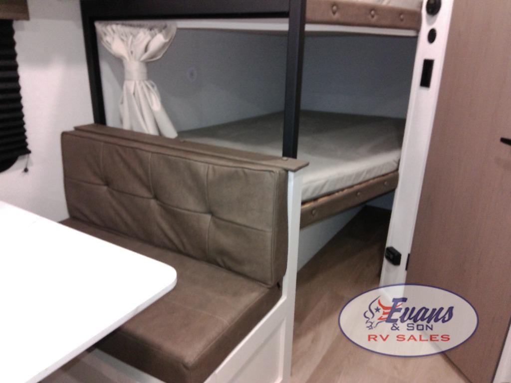 Camping trips are made complete in this travel trailer that can sleep seven each night! The little ones or your guest will love sleeping on the double-size bunks, while you take the queen bed in the front semi-private bedroom with a privacy curtain. A three-burner range and microwave oven will let you make meals each day, and a booth dinette provides a place to dine together. There are also convenient features found here, such as a pull-out pet dish and pull-out trash can, and there is ample storage space for your belongings. You will also appreciate the full bath that will let you stay clean throughout your trip without having to leave your trailer!