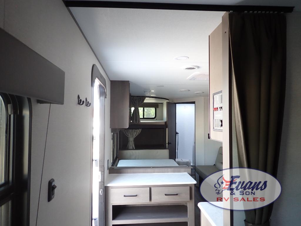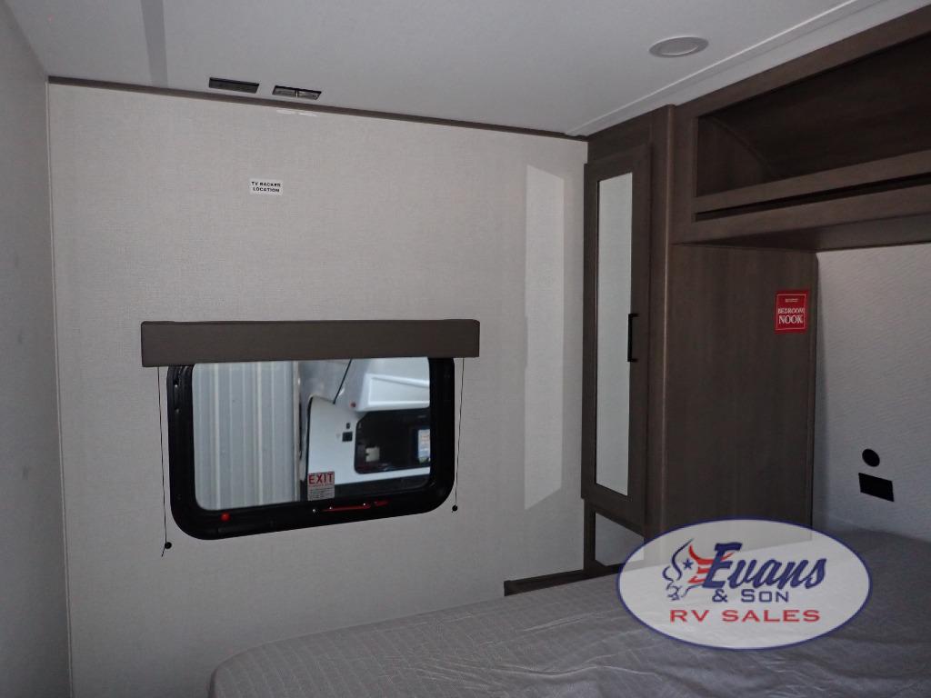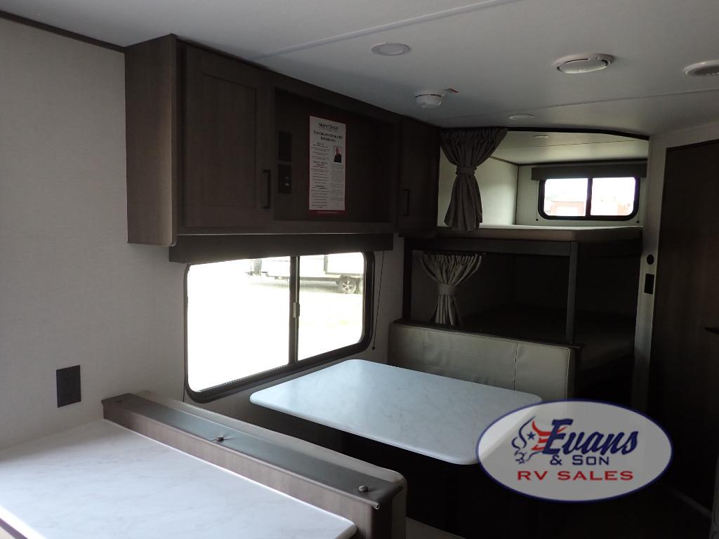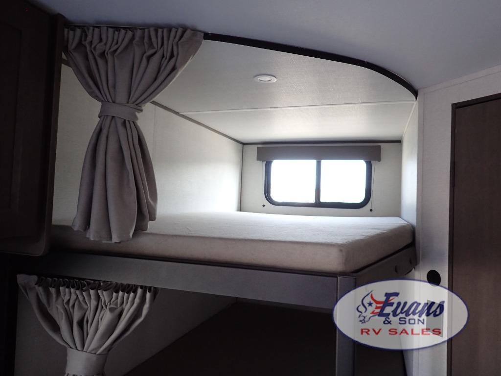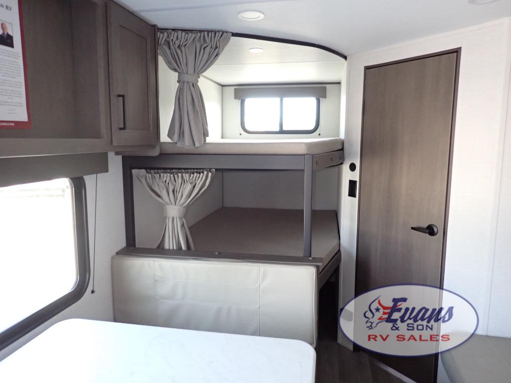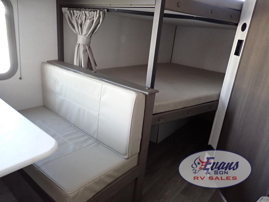 This is the perfect travel trailer if you like to camp with friends and family. Since there are double-size bunks, a queen bed in the front bedroom, plus a booth dinette and sofa, you can sleep eight campers each night! The three burner range and microwave in the kitchen will let you cook meals each day, and the 12V refrigerator will keep your cold items fresh. This model also includes a counter with extra storage underneath, a pull-out trash can storage for convenience, and a full bath to freshen up in each day. And you'll love having your own space in the front bedroom with a privacy curtain, dual wardrobes, and TV prep if you want to add a television!