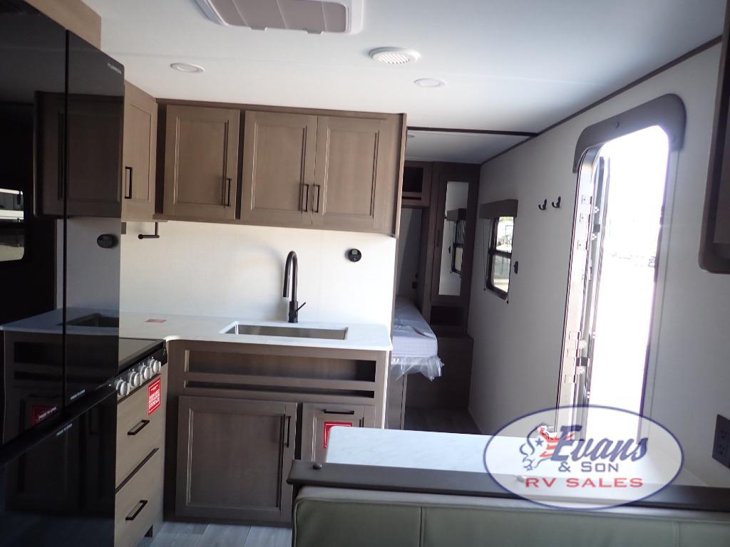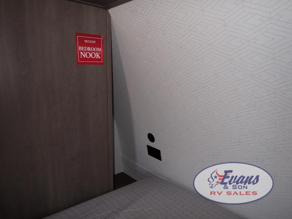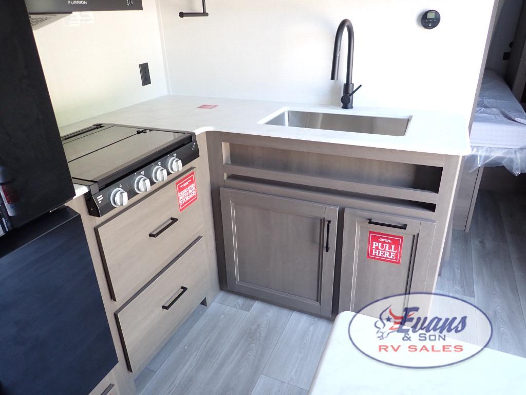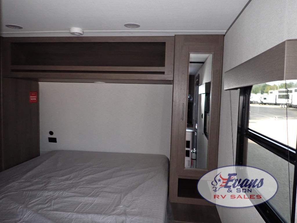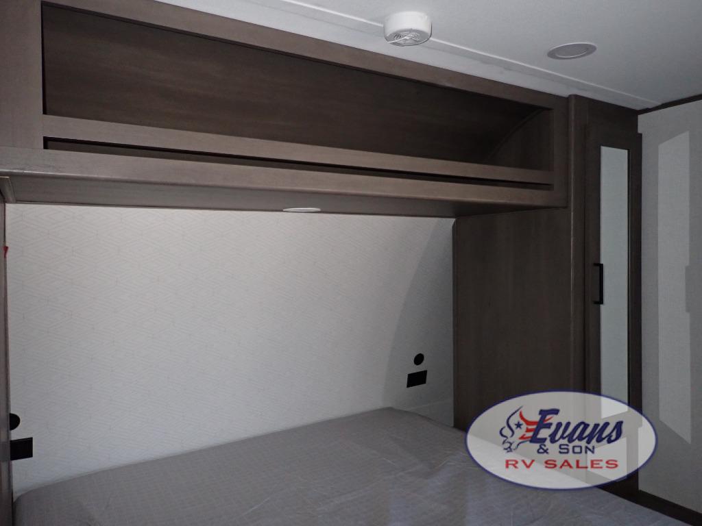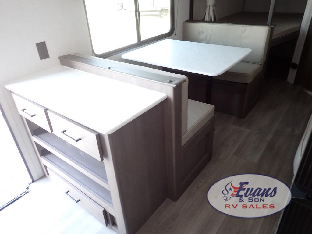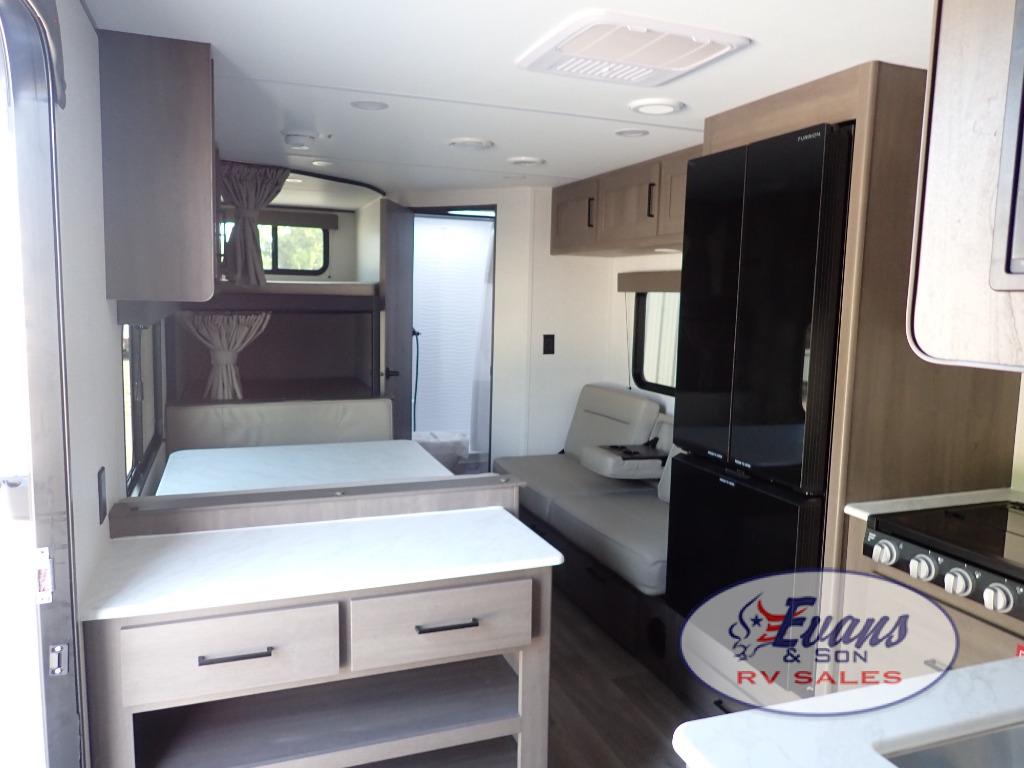 This is the perfect travel trailer if you like to camp with friends and family. Since there are double-size bunks, a queen bed in the front bedroom, plus a booth dinette and sofa, you can sleep eight campers each night! The three burner range and microwave in the kitchen will let you cook meals each day, and the 12V refrigerator will keep your cold items fresh. This model also includes a counter with extra storage underneath, a pull-out trash can storage for convenience, and a full bath to freshen up in each day. And you'll love having your own space in the front bedroom with a privacy curtain, dual wardrobes, and TV prep if you want to add a television!