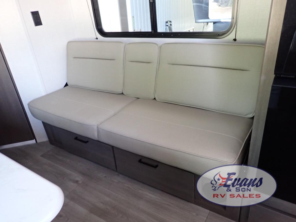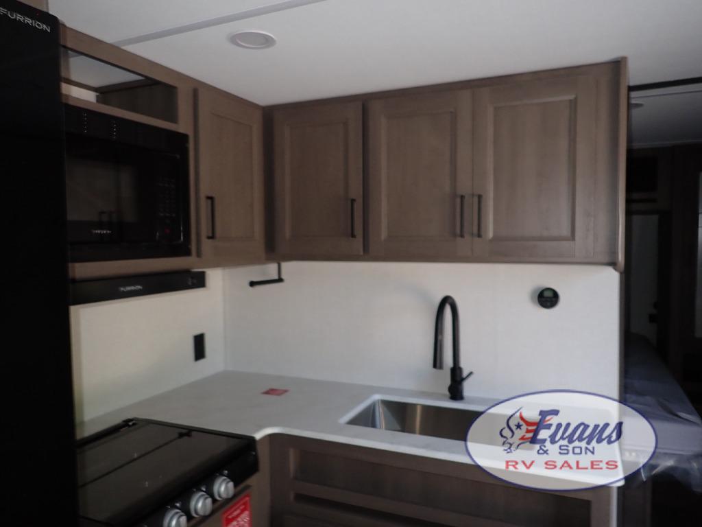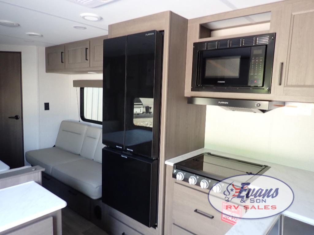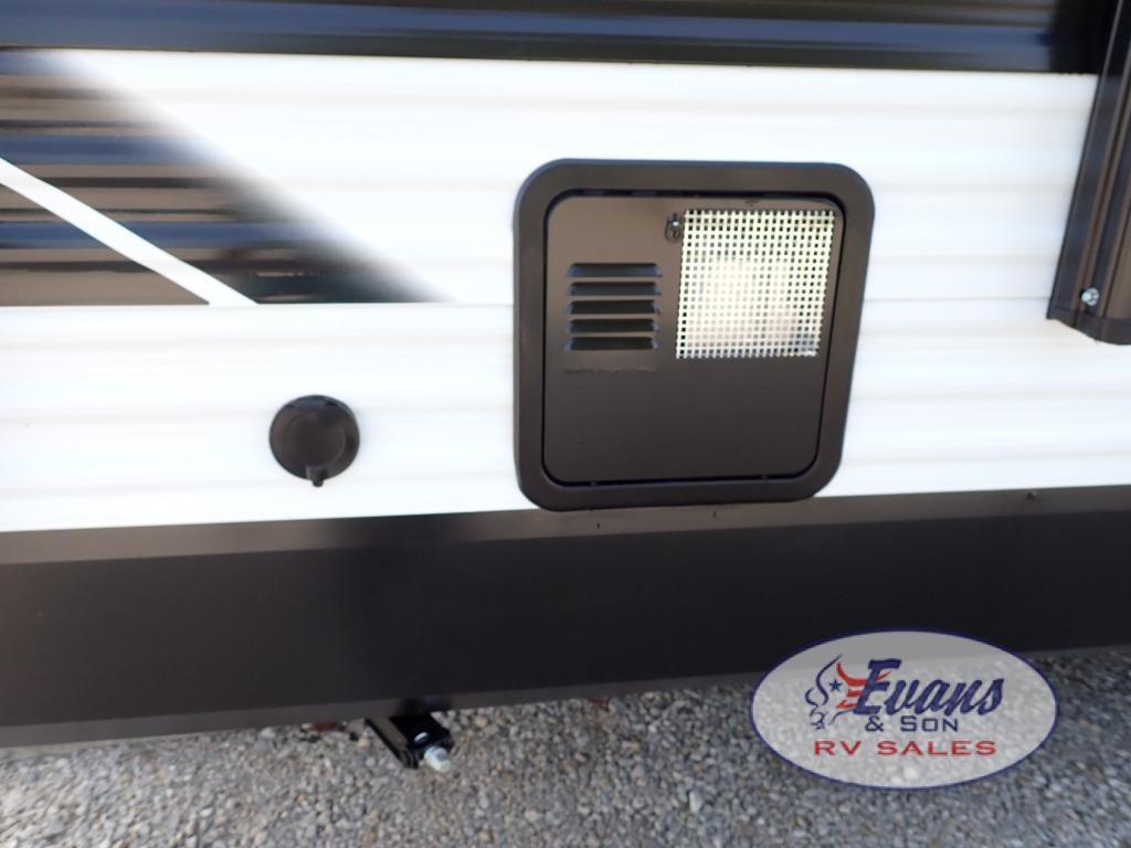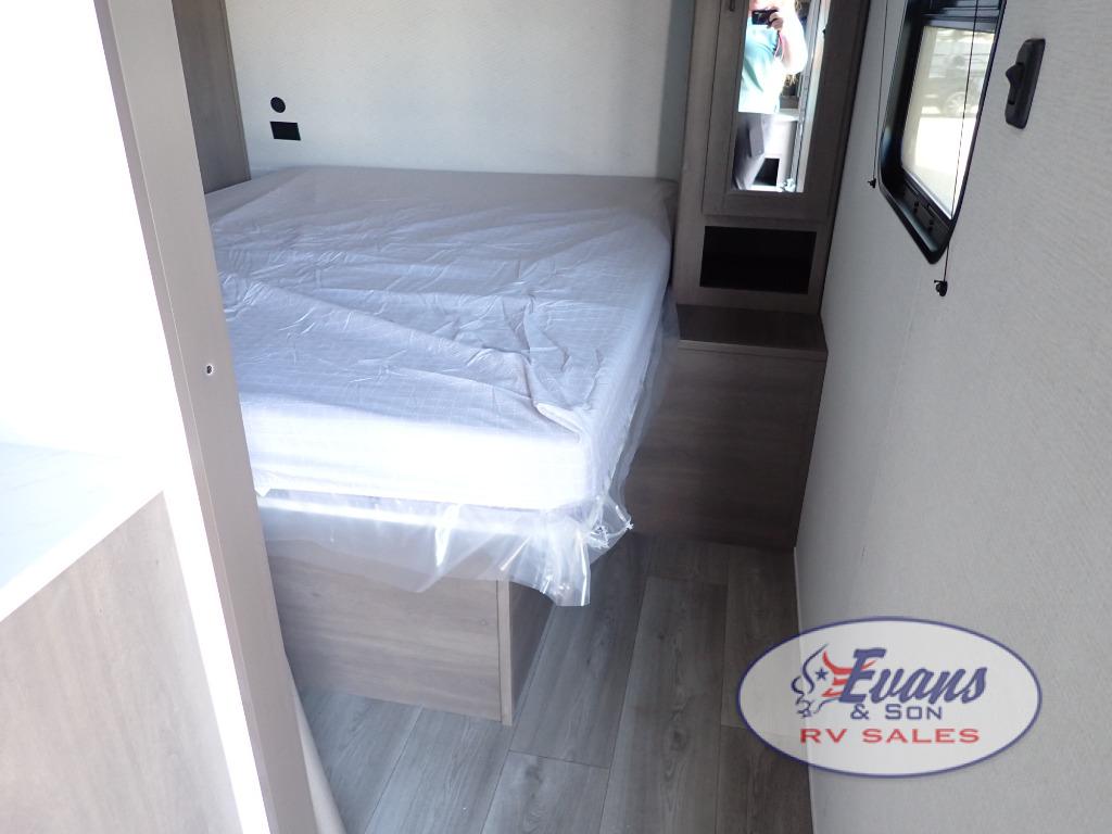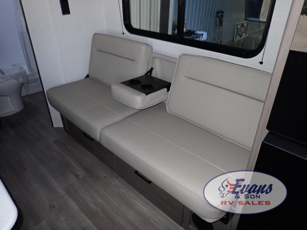 This is the perfect travel trailer if you like to camp with friends and family. Since there are double-size bunks, a queen bed in the front bedroom, plus a booth dinette and sofa, you can sleep eight campers each night! The three burner range and microwave in the kitchen will let you cook meals each day, and the 12V refrigerator will keep your cold items fresh. This model also includes a counter with extra storage underneath, a pull-out trash can storage for convenience, and a full bath to freshen up in each day. And you'll love having your own space in the front bedroom with a privacy curtain, dual wardrobes, and TV prep if you want to add a television!