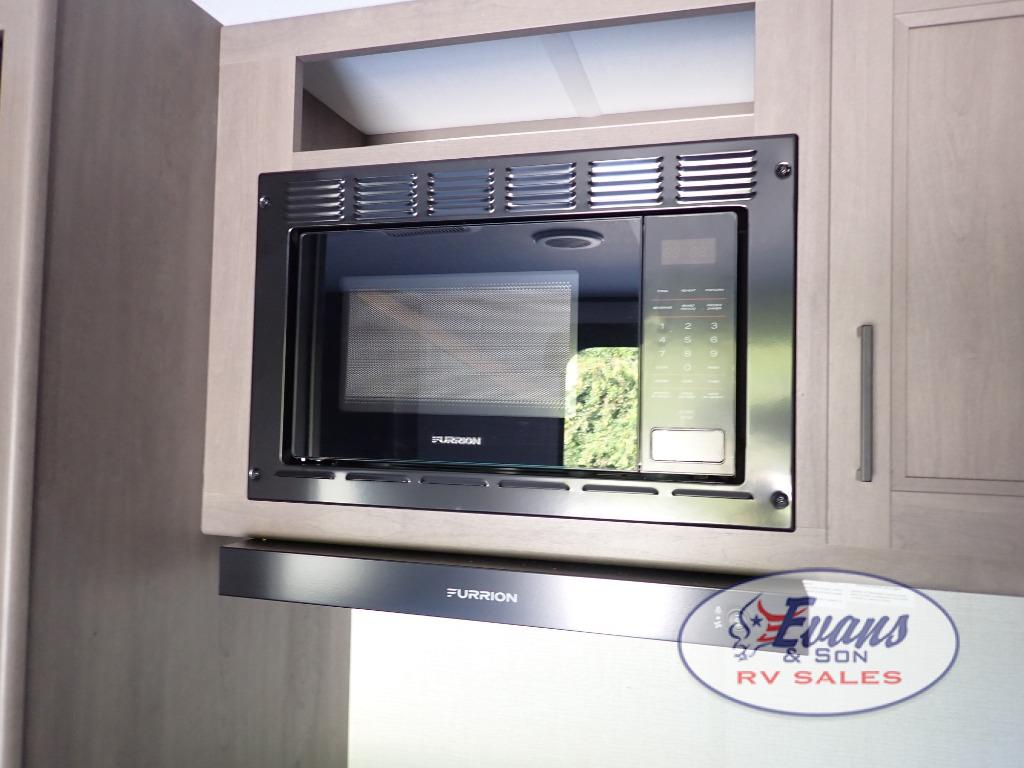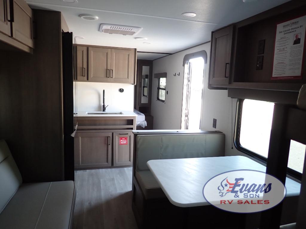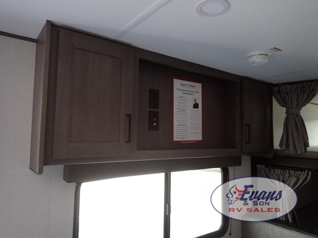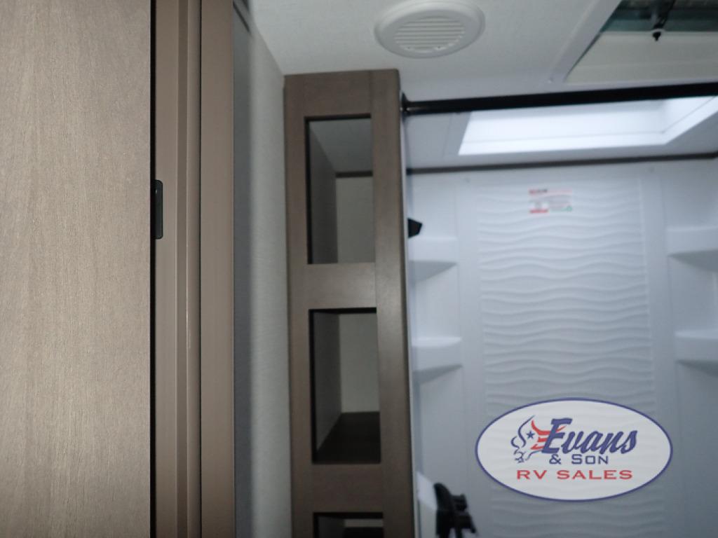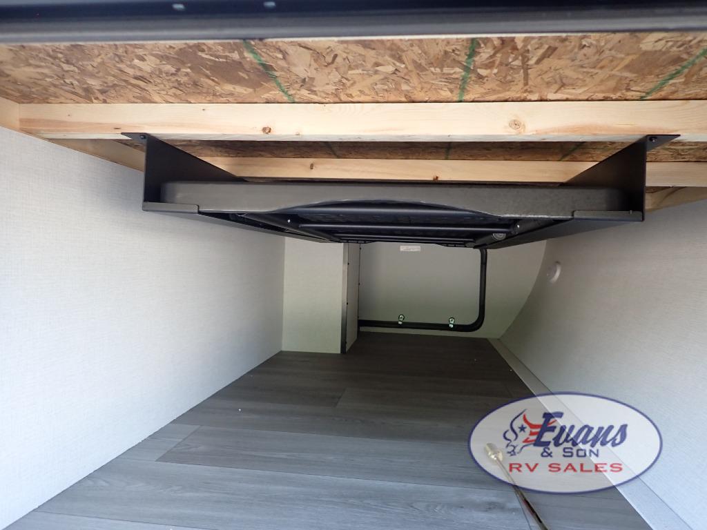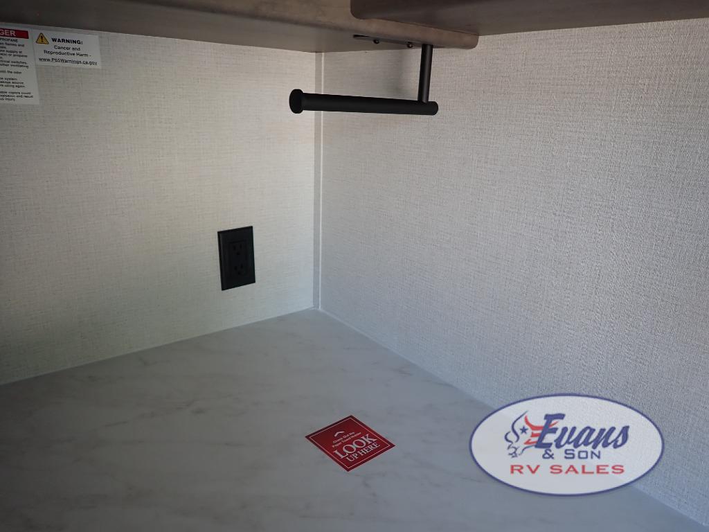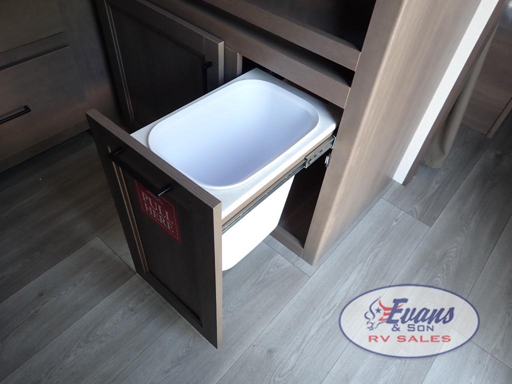 This is the perfect travel trailer if you like to camp with friends and family. Since there are double-size bunks, a queen bed in the front bedroom, plus a booth dinette and sofa, you can sleep eight campers each night! The three burner range and microwave in the kitchen will let you cook meals each day, and the 12V refrigerator will keep your cold items fresh. This model also includes a counter with extra storage underneath, a pull-out trash can storage for convenience, and a full bath to freshen up in each day. And you'll love having your own space in the front bedroom with a privacy curtain, dual wardrobes, and TV prep if you want to add a television!
