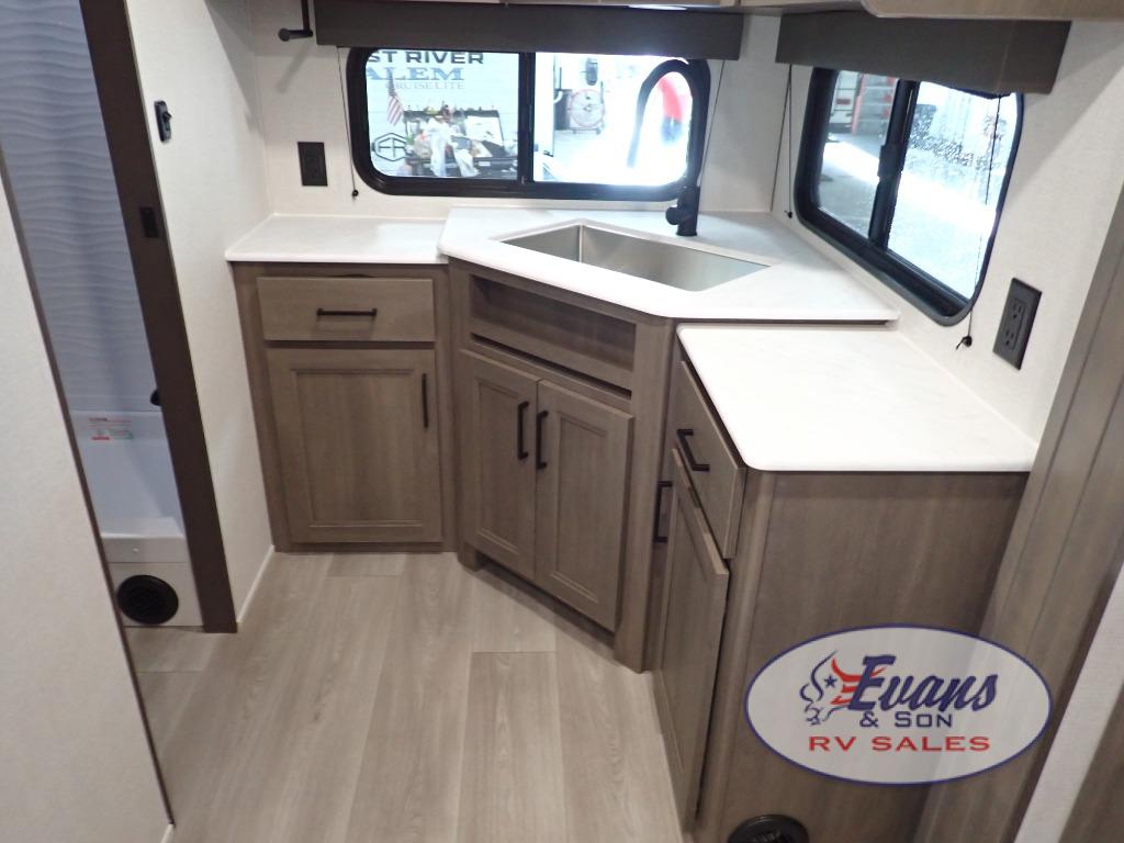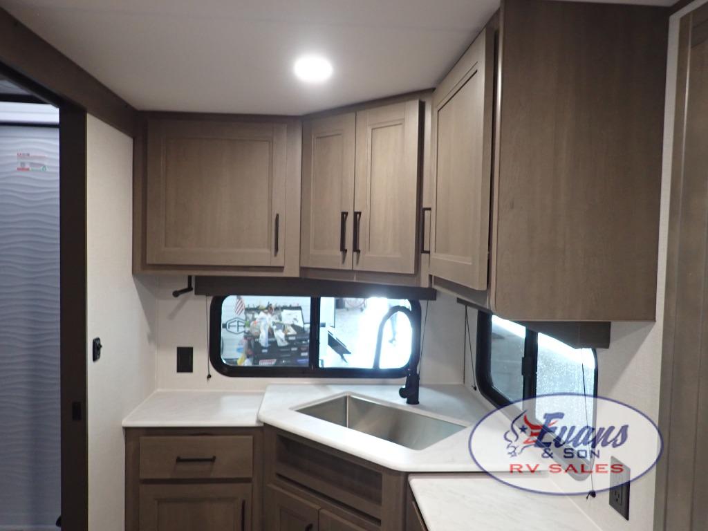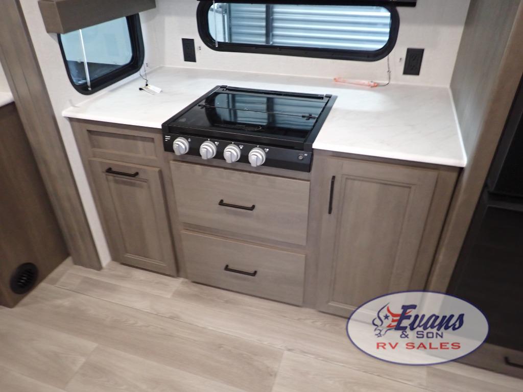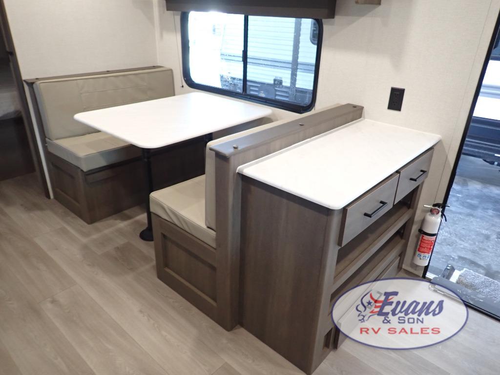It will be so easy to enjoy camping trips in this travel trailer for five to six! The main living area is made spacious by the large slide out, and here you'll find the 60" sleeper sofa and the kitchen appliances. A booth dinette across the room provides a place to dine and play board games, or you can head outdoors to sit under the 17' power awning with LED lights. The queen bed in the front private bedroom will have you feeling right at home, and the TV prep here gives you the option to watch movies in bed. This model also includes a rear corner kitchen with ample counter space and a large sink, and you'll find the full bath in the other rear corner!