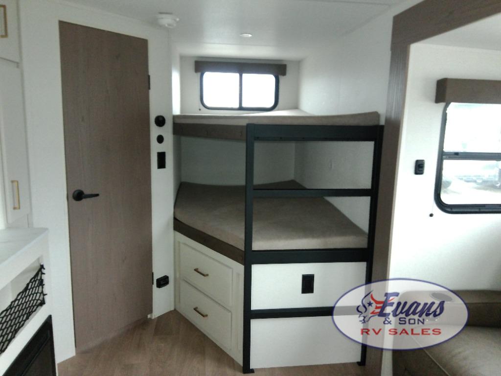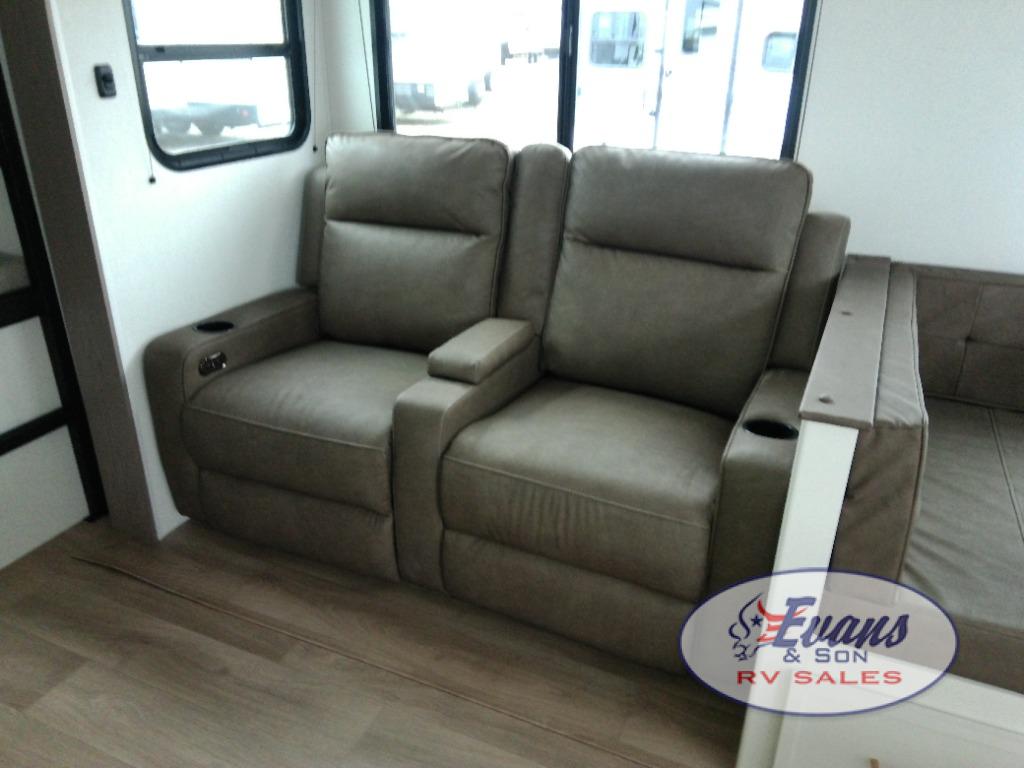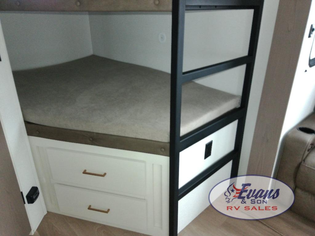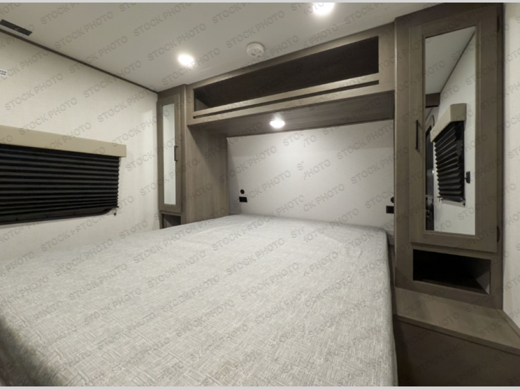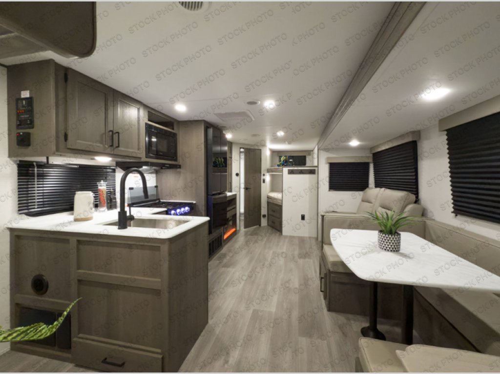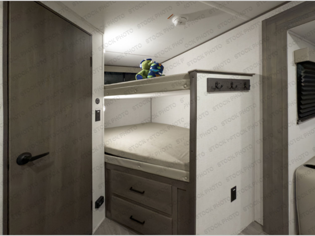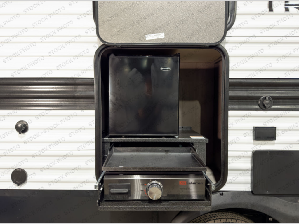 Get ready to take your travels to new heights with our incredible luxury travel trailer! The front bedroom has a queen bed, wardrobe, and overhead cabinets for all your favorite belongings, the perfect place to relax and recharge after a long day of adventure. The living room/kitchen combined area is equipped with a U-shaped dinette, three-burner cooktop, microwave, refrigerator, pantry, and 62” theater seating. Perfect for cooking up your favorite meals, entertaining friends and family, or simply relaxing and enjoying the comforts of home. The full bathroom is spacious and complete with a linen closet for added convenience. And with double-sized bunk beds featuring curtains and under-bunk storage, the kids will have their cozy retreat. But the adventure doesn't stop there! Outside, you'll find an exterior griddle with a 1.7 refrigerator, perfect for cooking up a storm in the great outdoors. And with a massive 19’ awning, you'll have plenty of shade and protection from the elements, plus, with two entry/exit doors and pass-through storage, you'll have easy access to the trailer and all your gear.