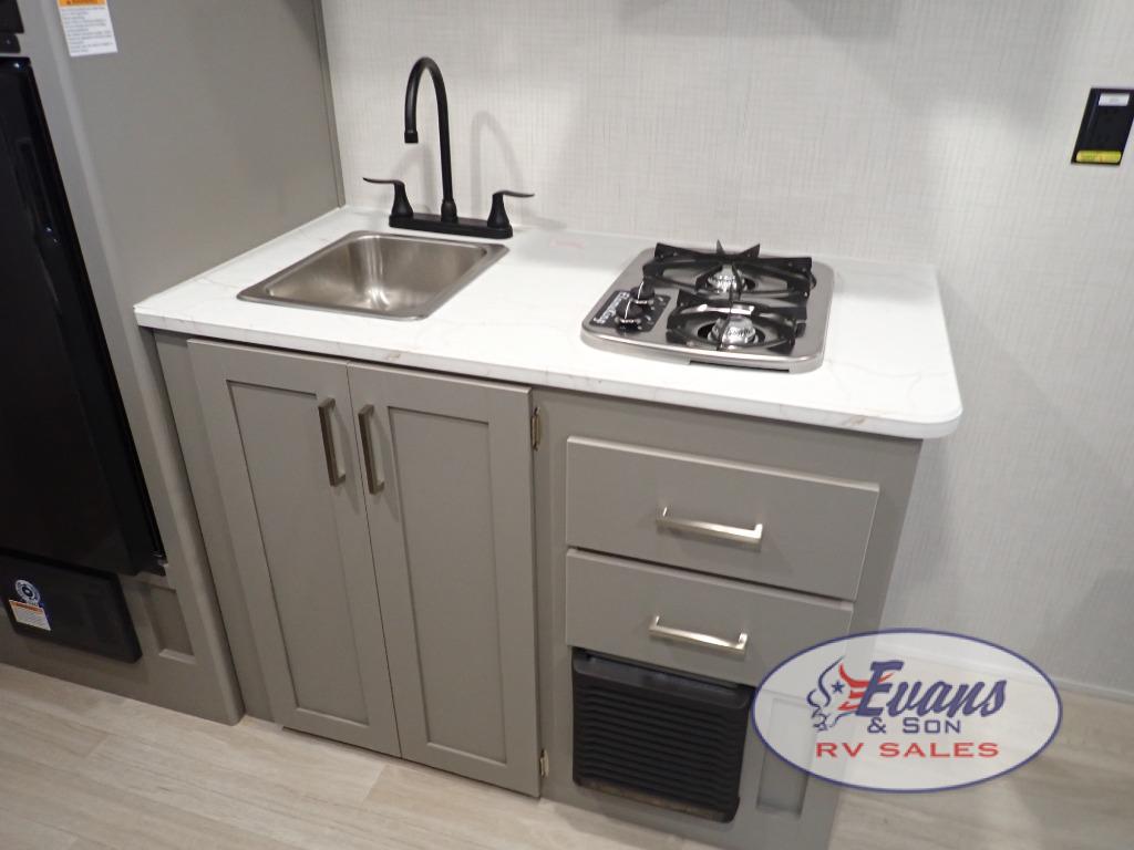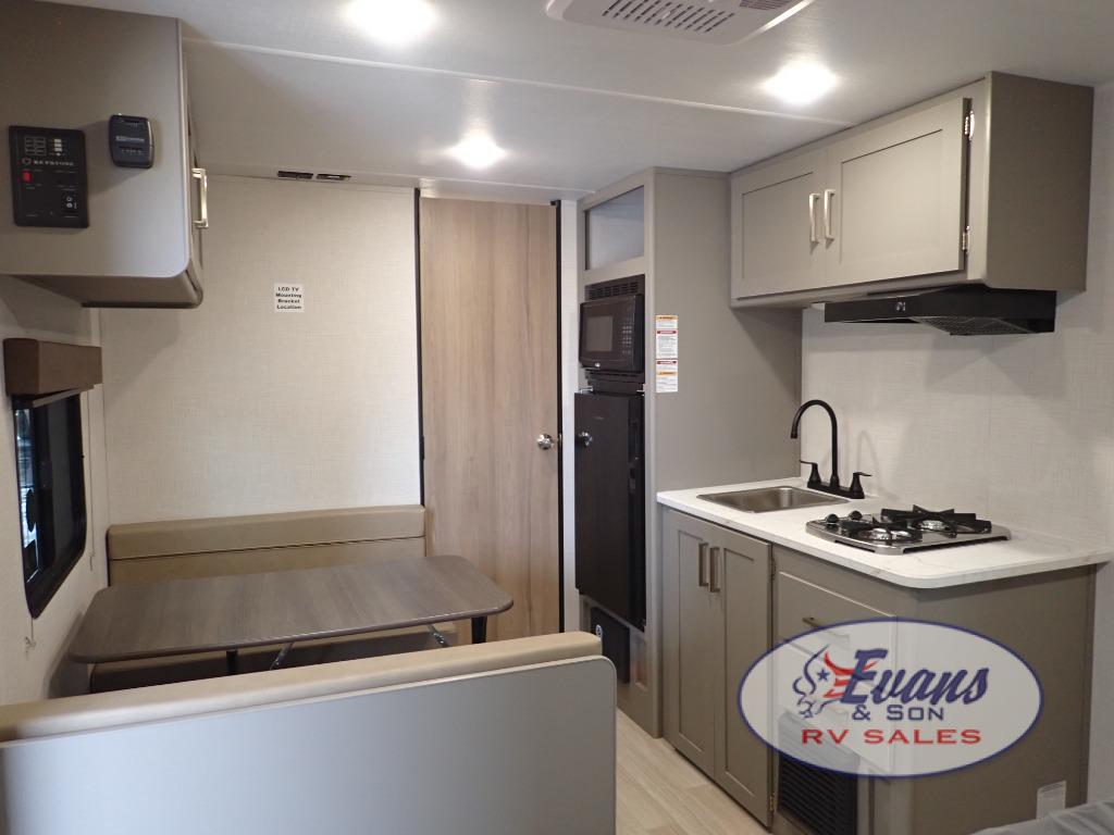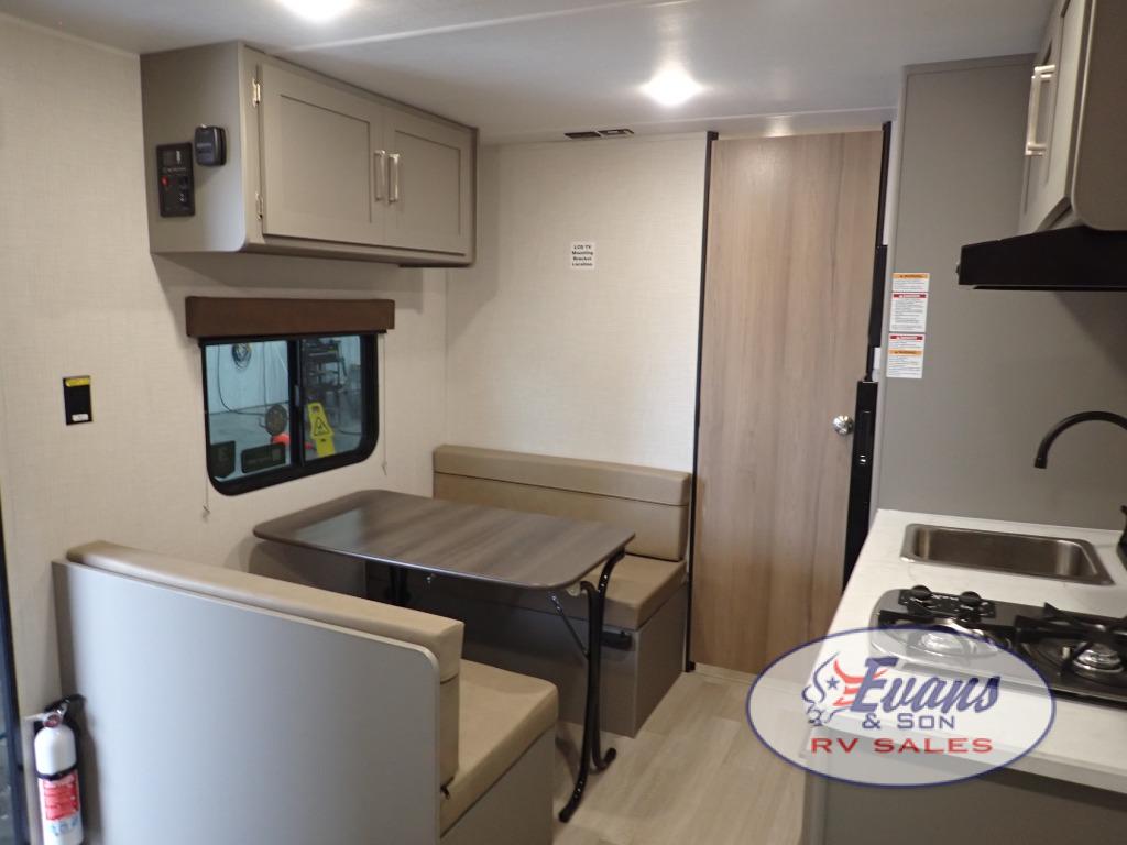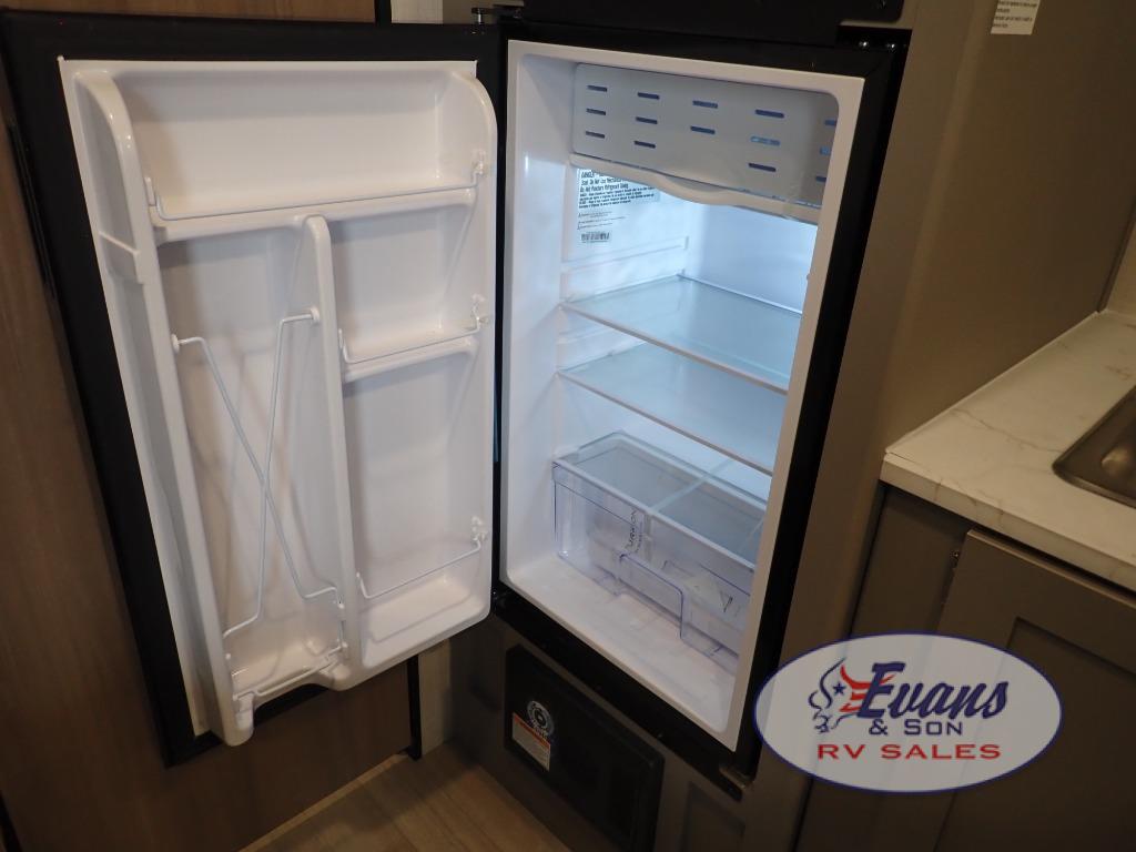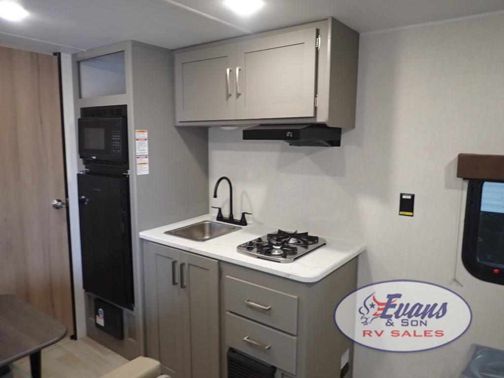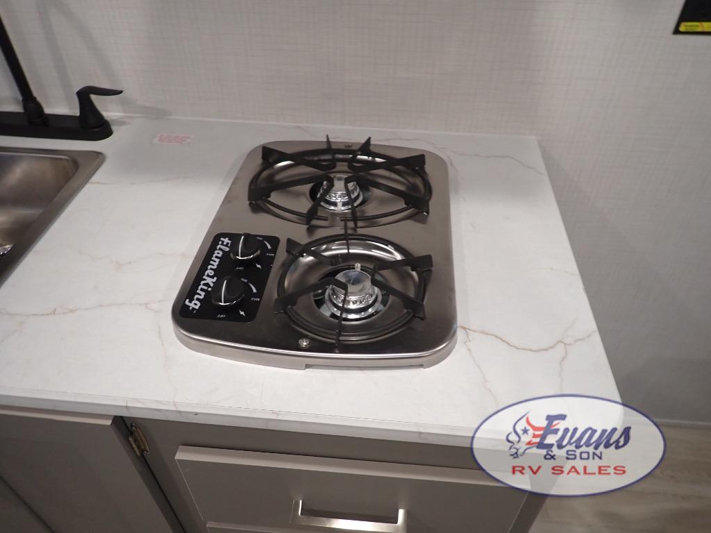 It's time to enjoy the great outdoors with family and friends at the campgrounds you like to meet everyone at! This trailer will allow three to four to camp comfortability with amenities such as a two burner cooktop, a 3.3 cu. ft. refrigerator, and a spacious rear full bathroom. The booth dinette offers a place to dine, read a book and even house an overnight guest. This model also includes a walk-around queen bed that will make your space feel a little more like home!