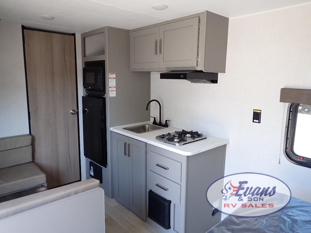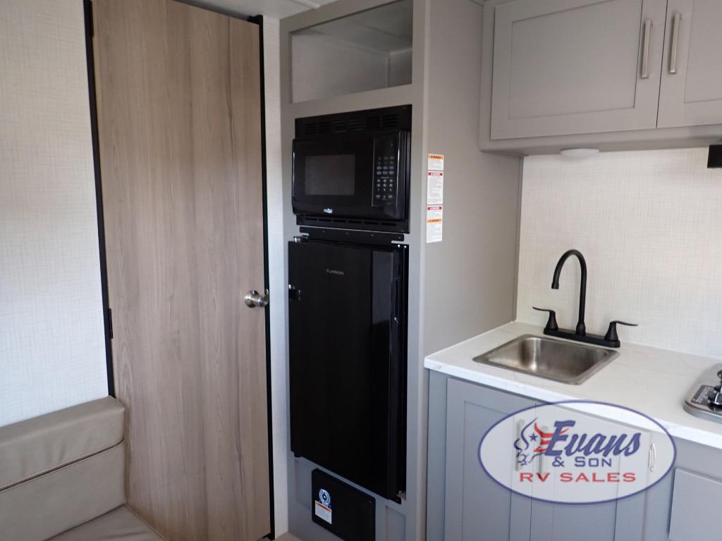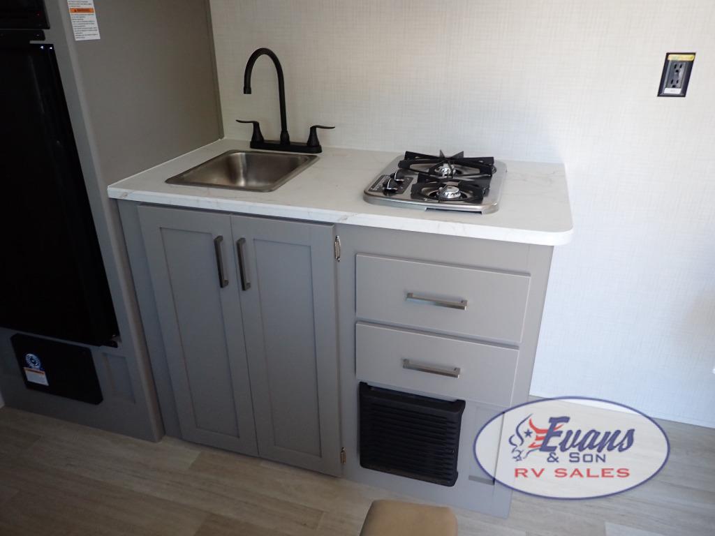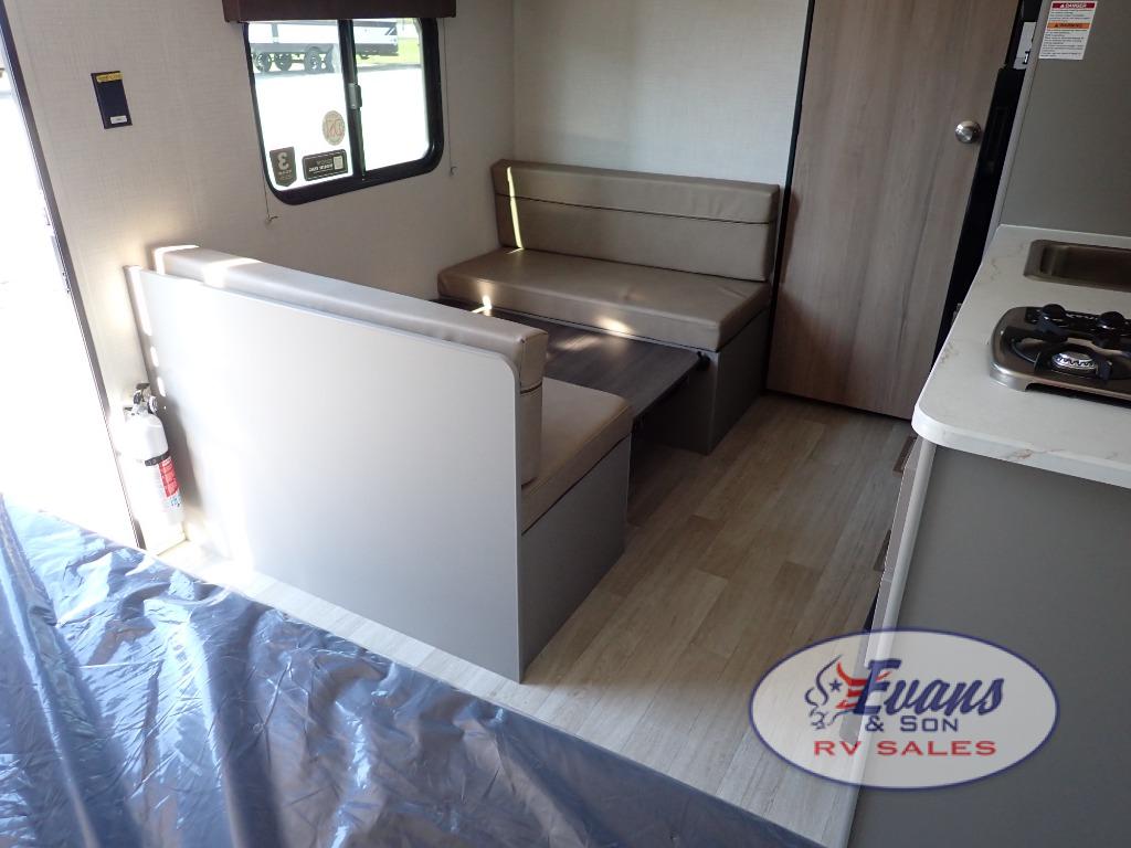 It's time to enjoy the great outdoors with family and friends at the campgrounds you like to meet everyone at! This trailer will allow three to four to camp comfortability with amenities such as a two burner cooktop, a 3.3 cu. ft. refrigerator, and a spacious rear full bathroom. The booth dinette offers a place to dine, read a book and even house an overnight guest. This model also includes a walk-around queen bed that will make your space feel a little more like home!