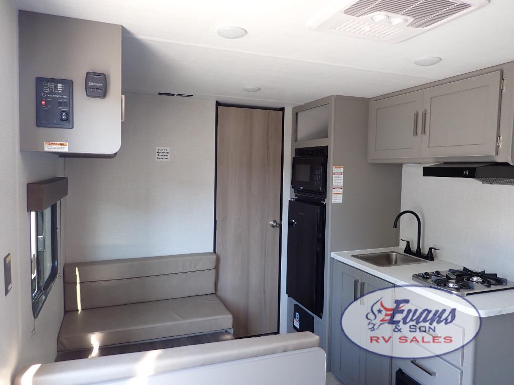 With any Hideout Mini travel trailer by Keystone, you will enjoy lightweight towing thanks to their single-axle! The AlphaPly TPO roof membrane is ultra durable, and the power awning will provide protection from the sun as you relax in your camp chairs outside. Each model includes blackout night shades, LED lighting, plus many more interior comforts. There is also a roof A/C and 20K BTU furnace to keep you comfortable, plus a tankless water heater for endless hot showers!