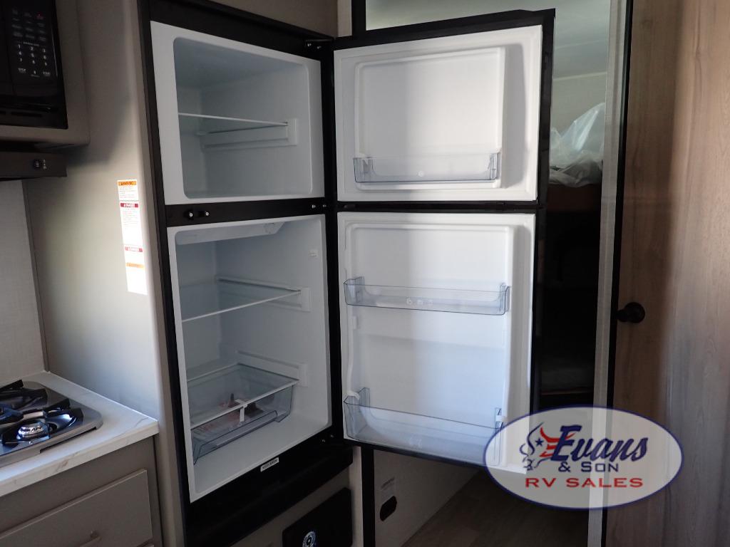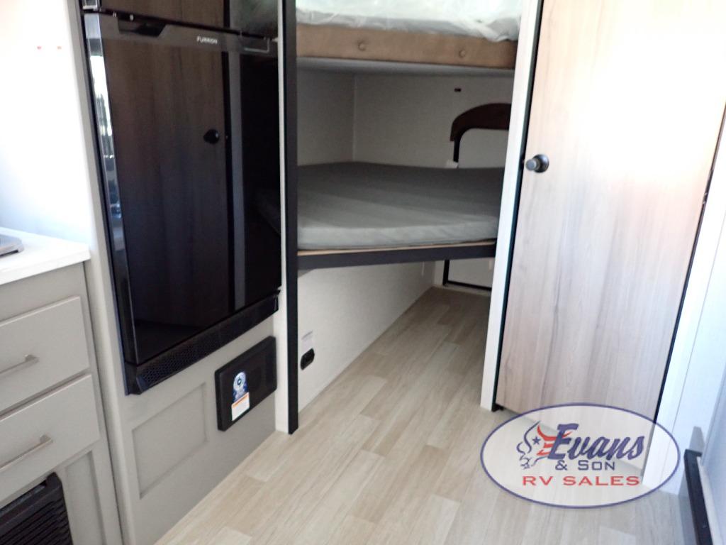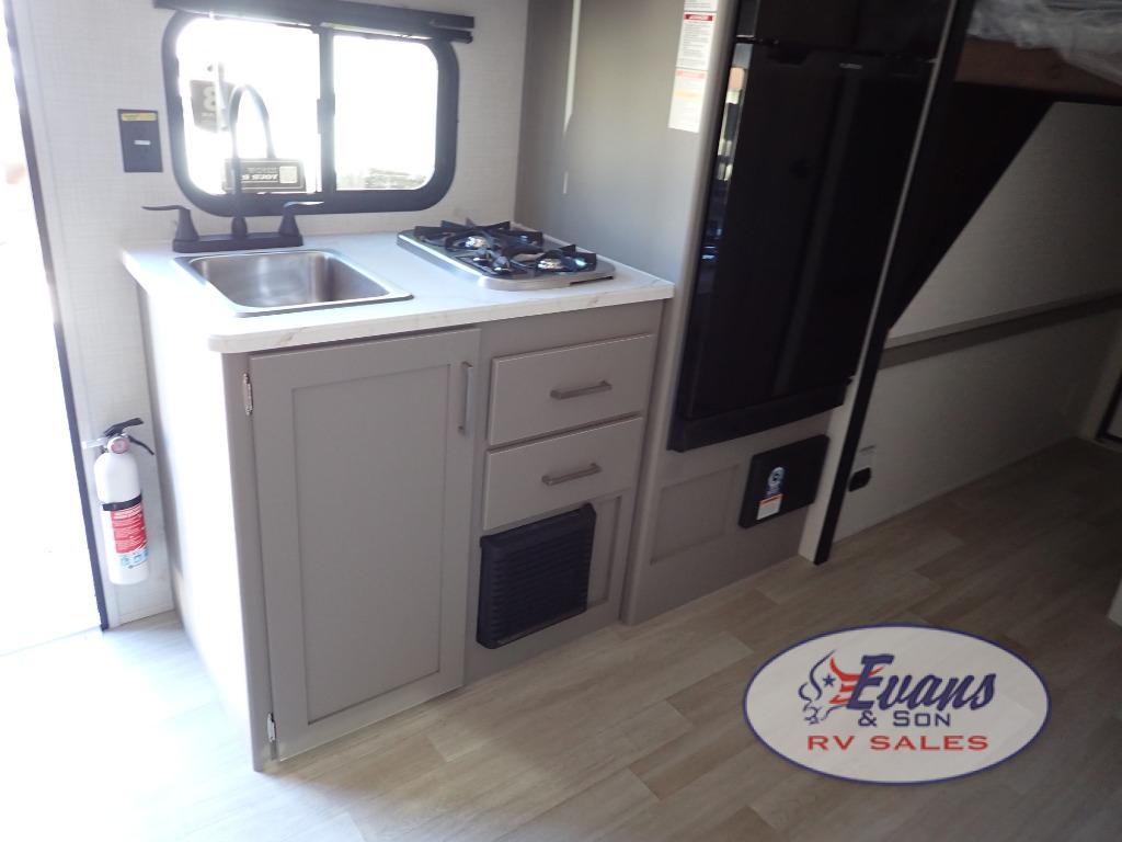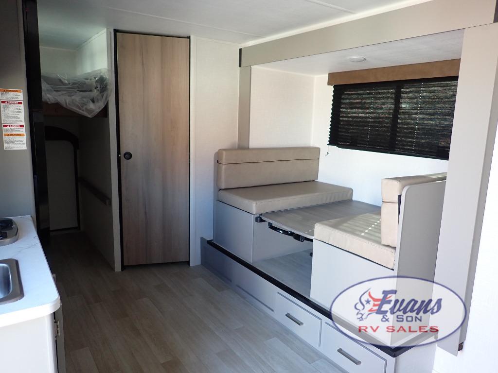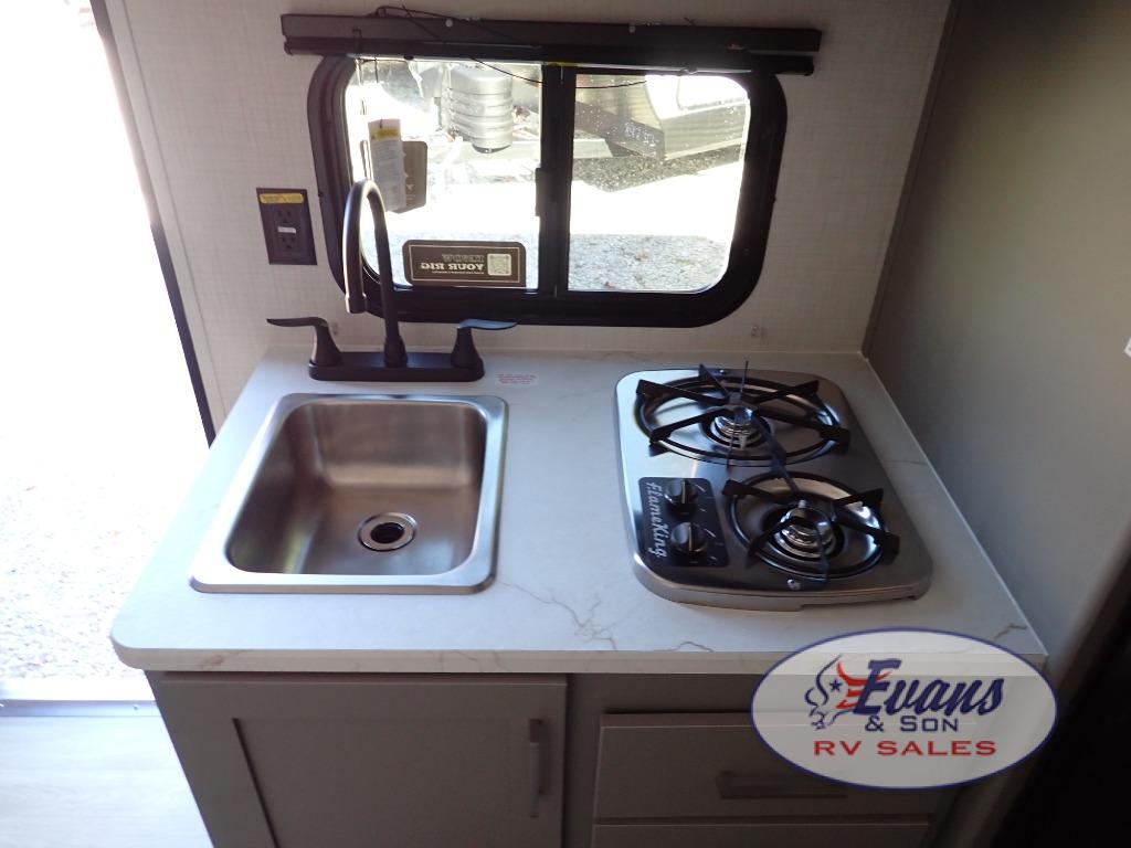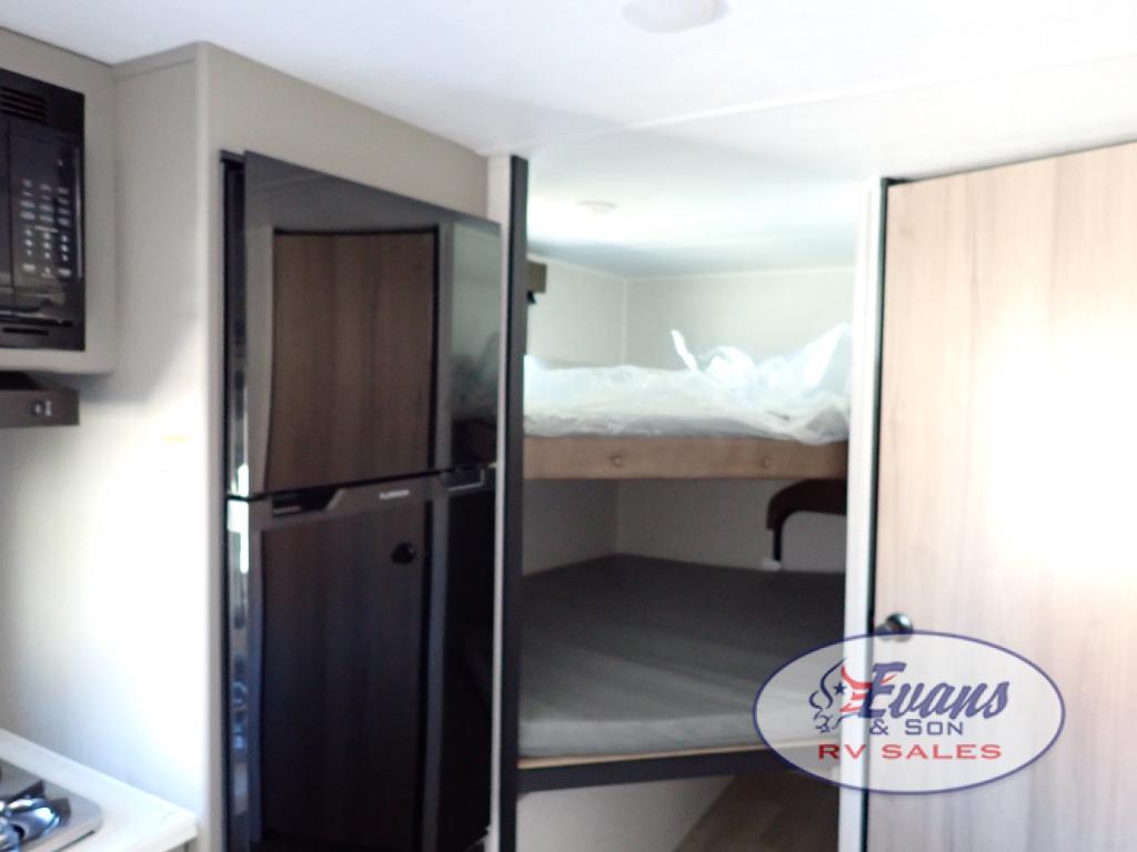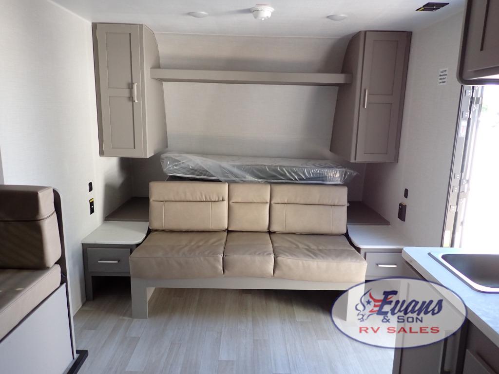 You will love how versatile this travel trailer is with its front Murphy bed that has a queen bed to lay your head on at night, folds down into a sofa, and even has storage underneath it! There is a set of double bunk beds in the rear corner and a booth dinette slide with storage drawers to keep your games out of the way. There is also outside storage under the bunks where you can easily flip up the bottom bunk to unload everything! You can keep everyone well fed with the two burner cooktop and 7.7 cu. ft. refrigerator, and the 15' power awning outdoors will provide a place for you all to visit after dinner.