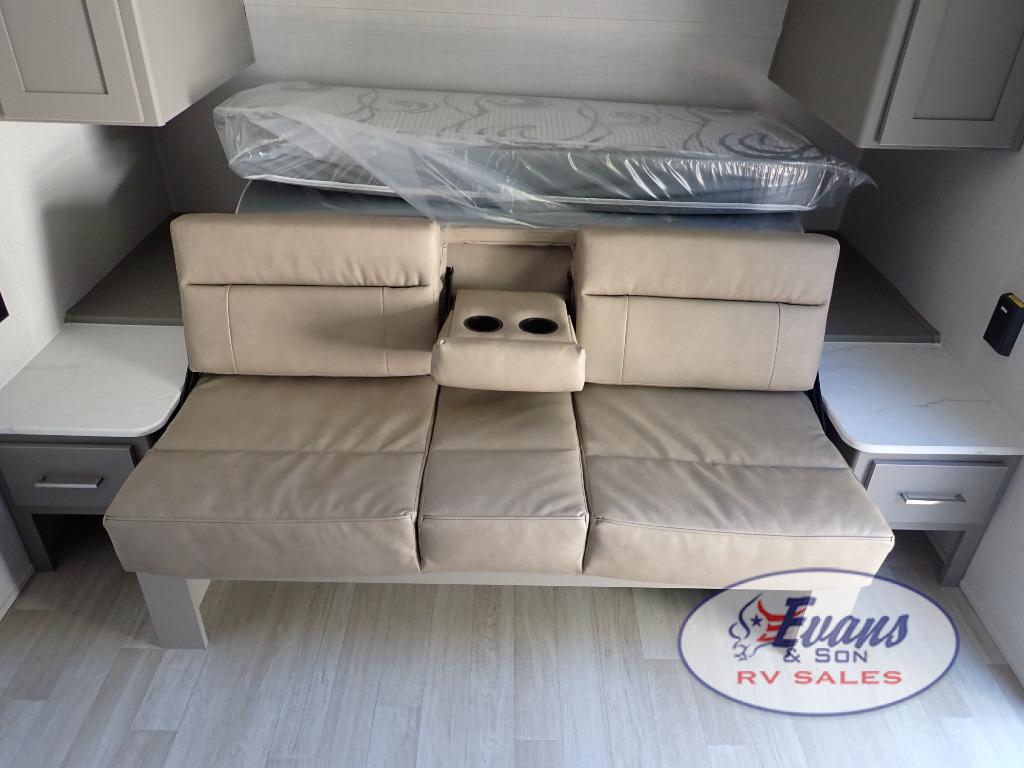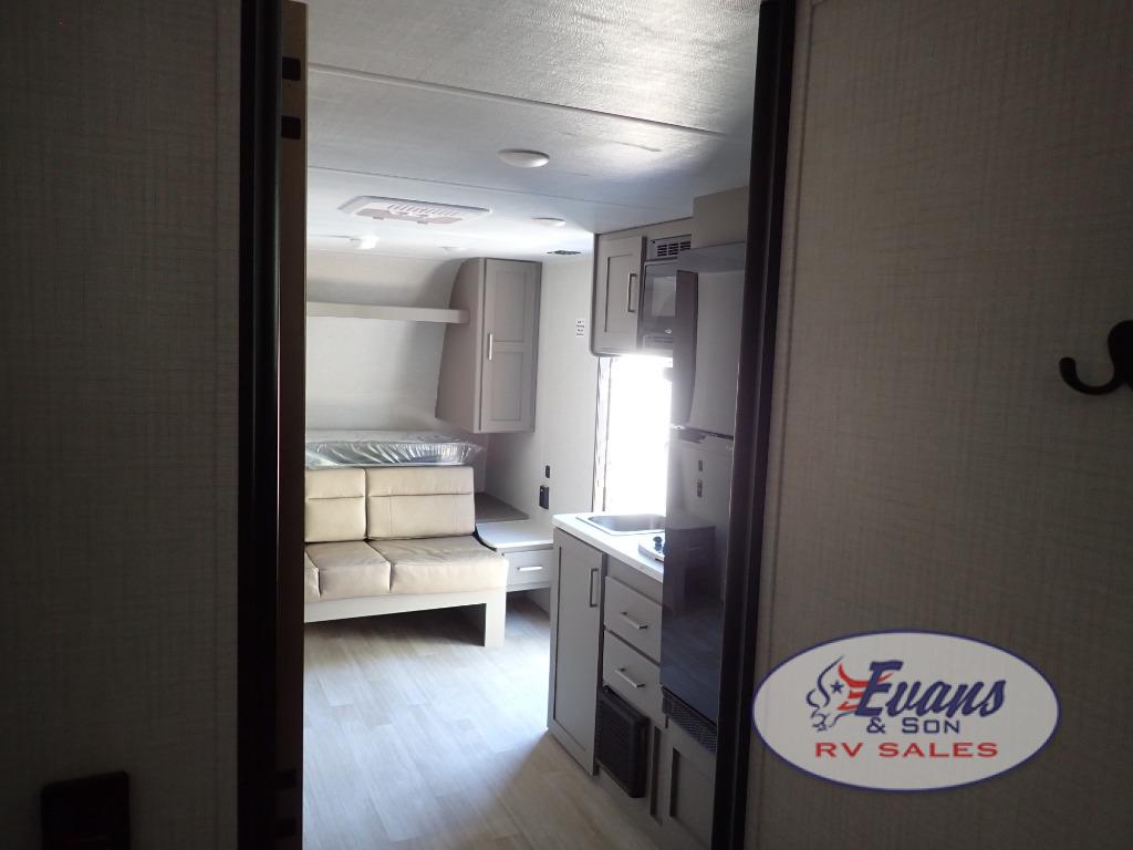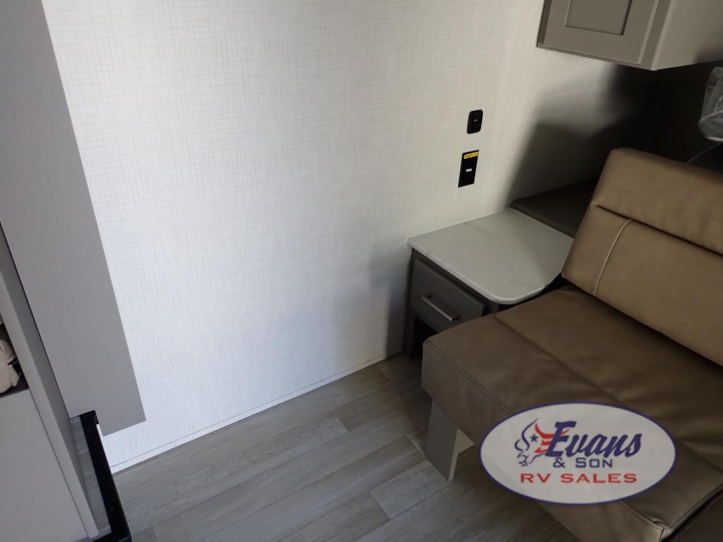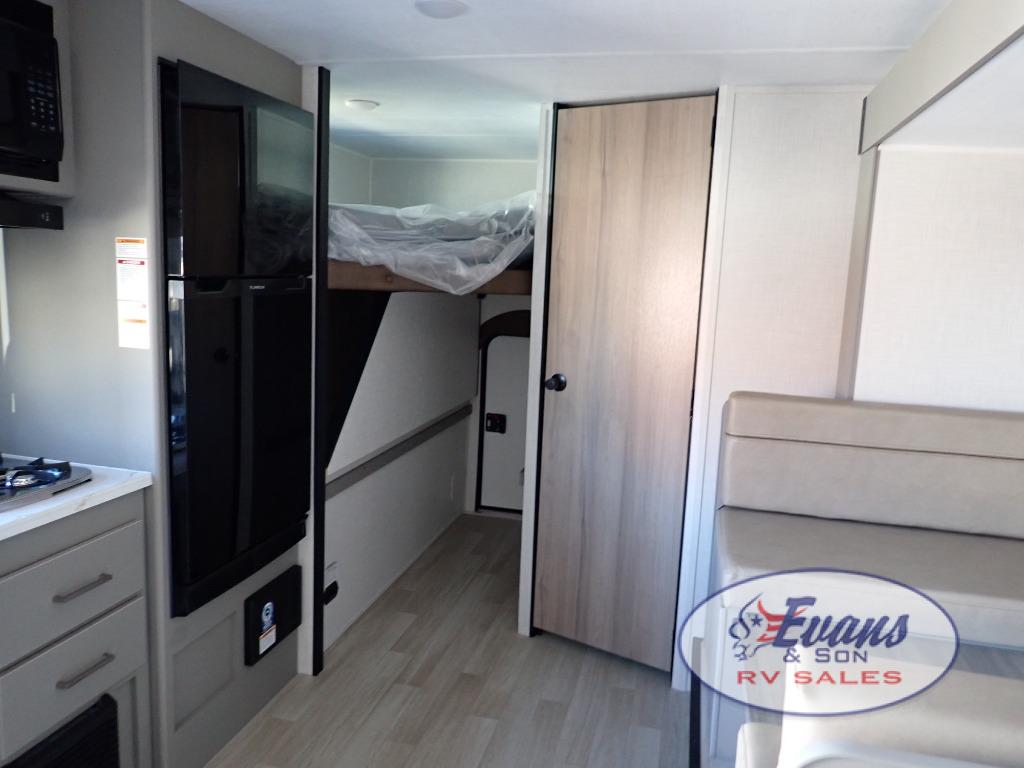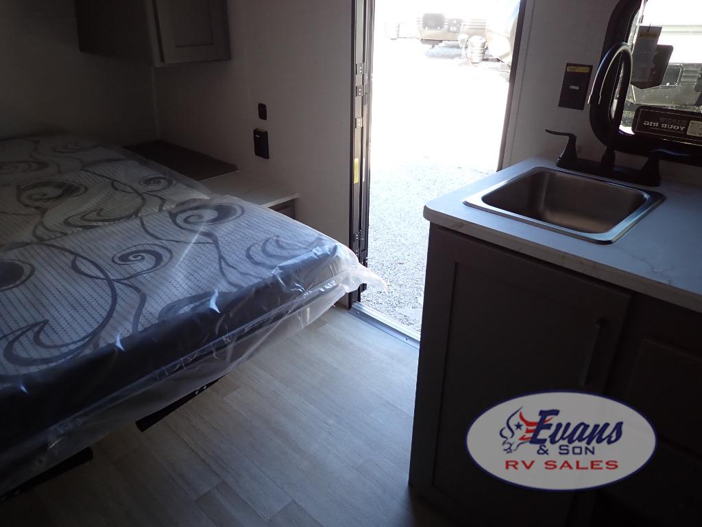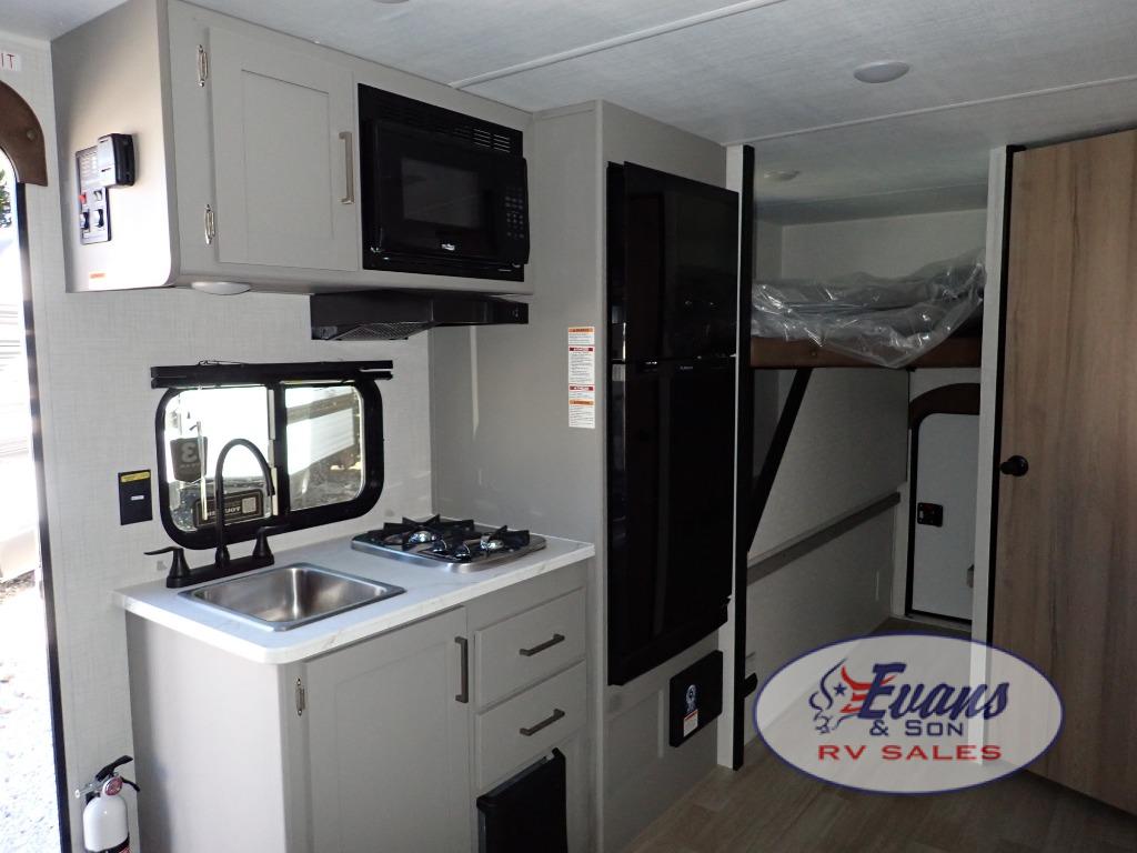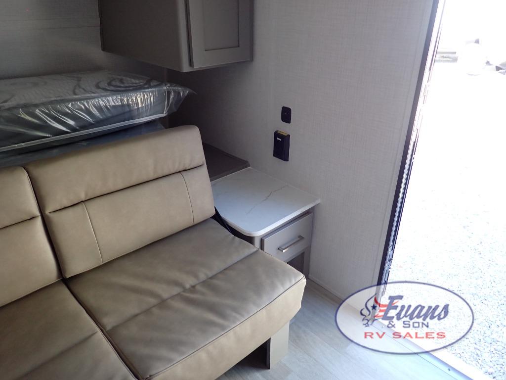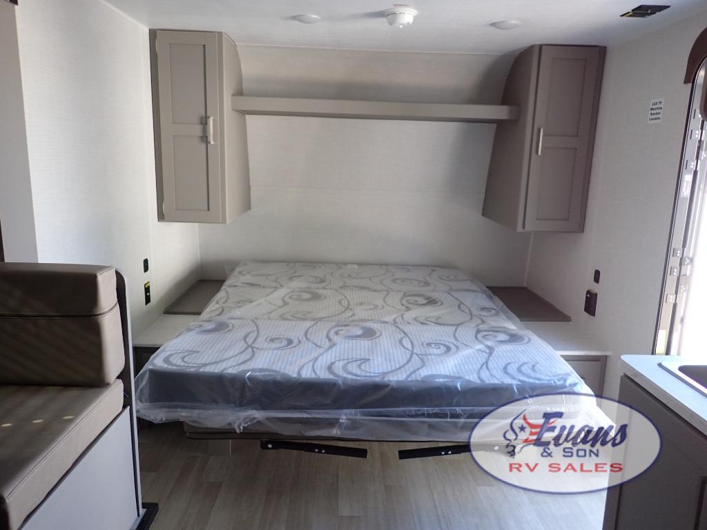 You will love how versatile this travel trailer is with its front Murphy bed that has a queen bed to lay your head on at night, folds down into a sofa, and even has storage underneath it! There is a set of double bunk beds in the rear corner and a booth dinette slide with storage drawers to keep your games out of the way. There is also outside storage under the bunks where you can easily flip up the bottom bunk to unload everything! You can keep everyone well fed with the two burner cooktop and 7.7 cu. ft. refrigerator, and the 15' power awning outdoors will provide a place for you all to visit after dinner.
