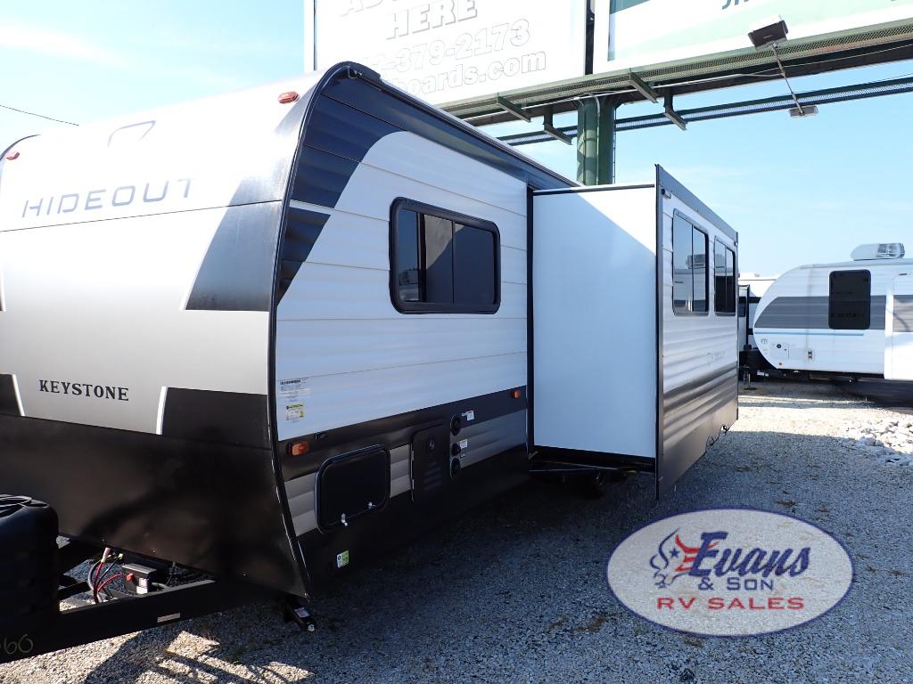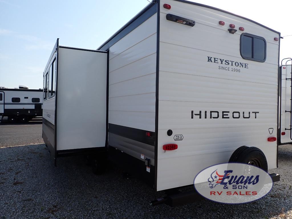 With any Hideout Sport travel trailer by Keystone you will enjoy simplified camping solutions that won't break the bank! Each model is constructed with a durable AlphaPly TPO roof membrane tinted safety glass windows, and an I-beam frame. There are power tongue jacks and heavy duty stabilizer jacks that will make it easier than ever to hitch up and go. An XL entry assist handle will also provide convenience, along with a power awning that will provide much wanted shade during the day. You will feel right at home with stylish decor, blackout night shades, and cozy bed with storage underneath!