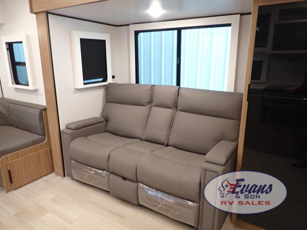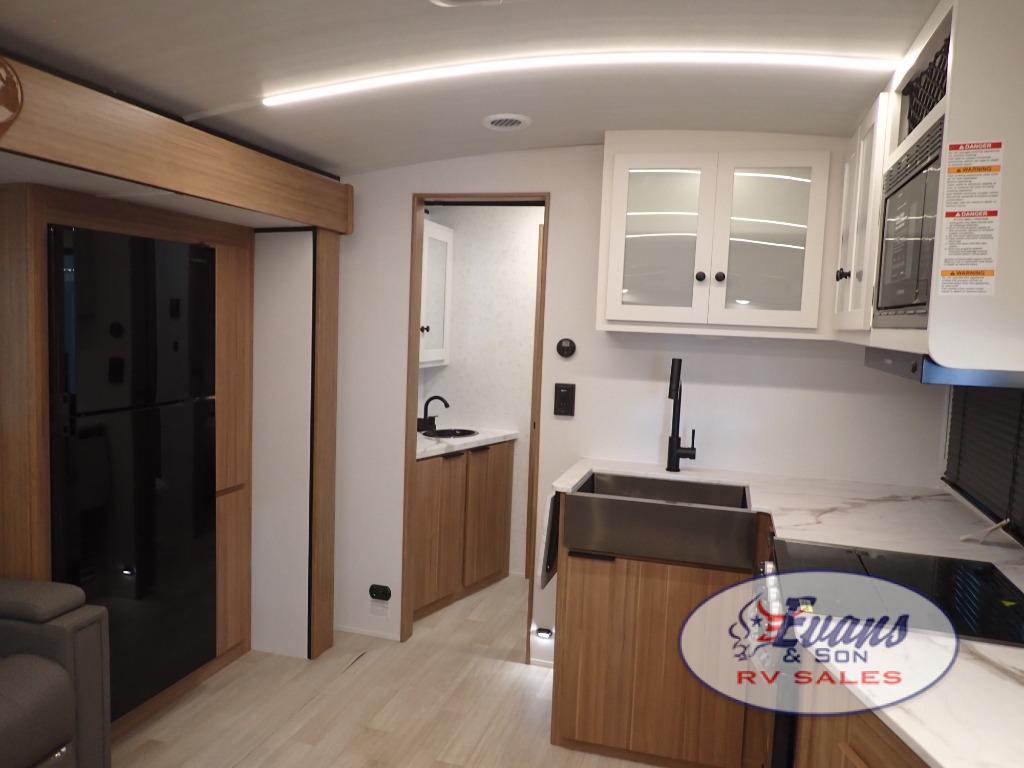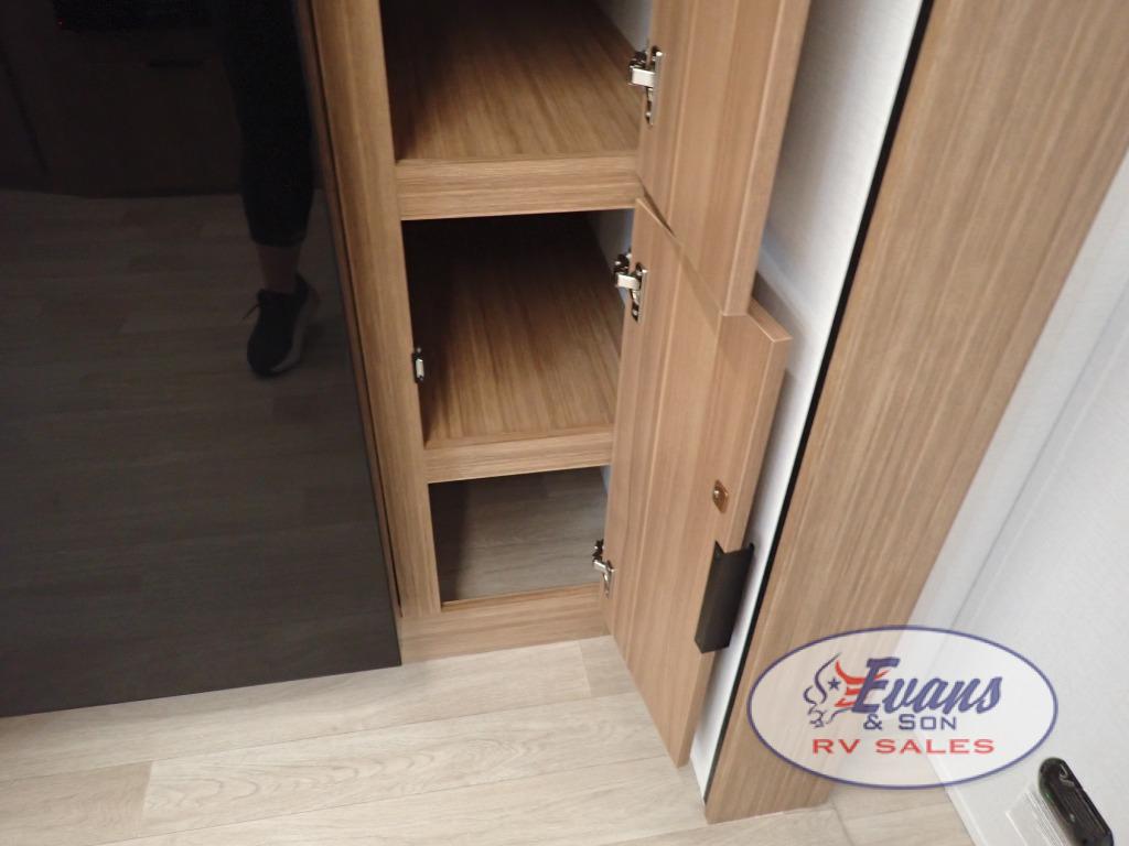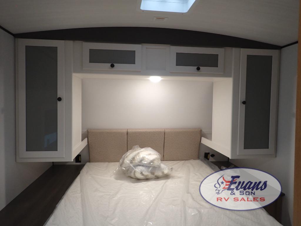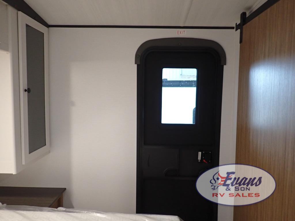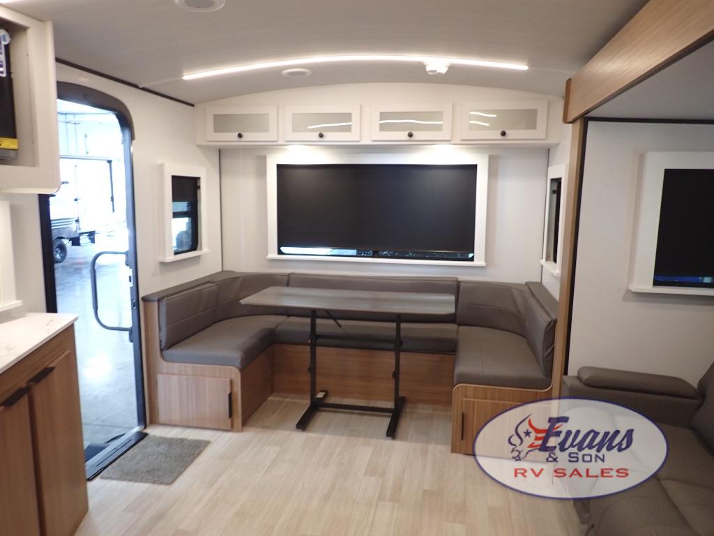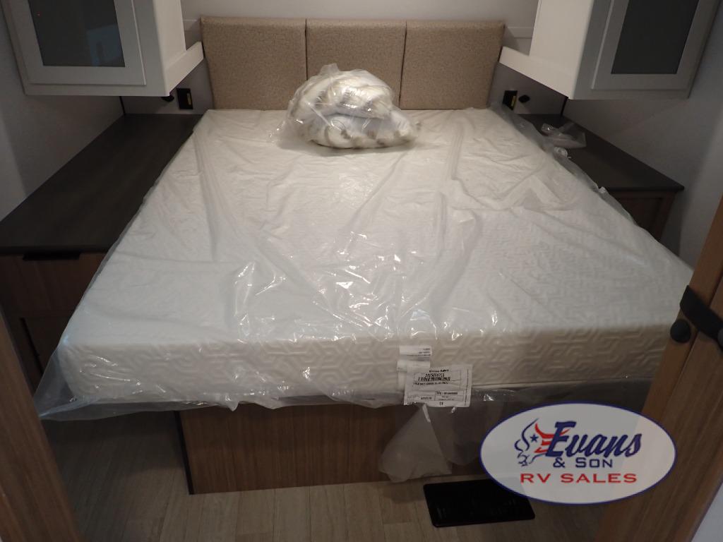 If you're looking to upgrade from a tent to a travel trailer, the time is now with this model! You will love having your own master bedroom up front with a queen bed, dual bedroom wardrobes and your own exterior entry door. The second entry door leads right into the combined kitchen and living area for added convenience. Your crew can dine or play a game around the U-shaped do-more dinette table or relax on the tri-fold sofa across from the entertainment center. These pieces of furniture will also double as your guests' sleeping space at night, and you have the option to choose luxury cinema recliners in place of the sofa if you don't need that much sleeping room. There is also a full walk-through bath to clean up in each day plus a fully-equipped kitchen to make meals!