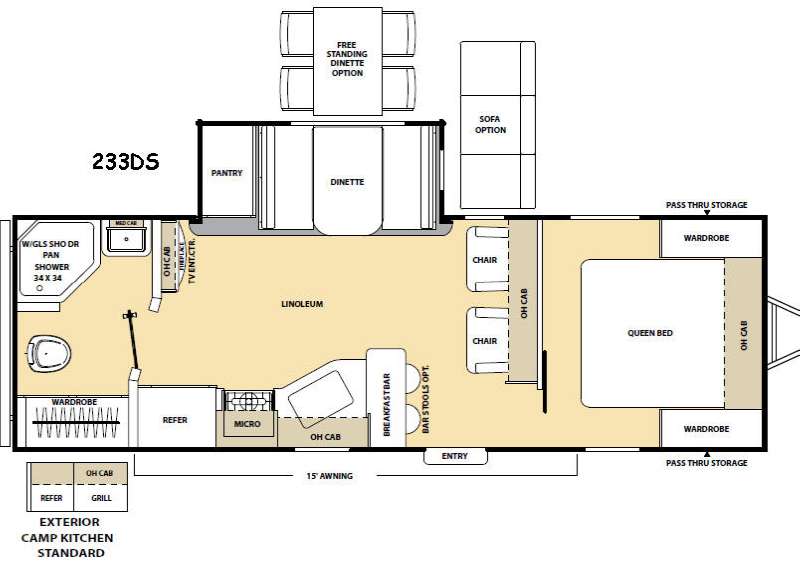 Some additional features that you are sure to be pleased about are a 15' awning which can easily create a bit of outdoor living space, a large pass-through storage compartment up front, and an exterior camp kitchen which features a refrigerator, grill, and storage, plus so much more!