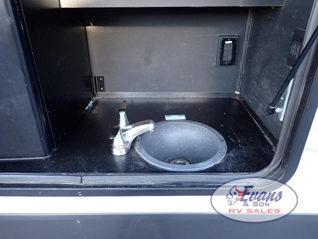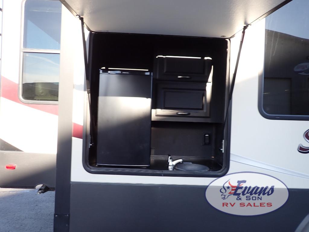 Come see just how easy it is to enjoy camping and entertaining in this triple-slide Sandpiper fifth wheel. In the central living area you will find room for everyone to join you on the hide-a-bed sofa, theater seating, and free-standing table because of the opposing slides, and you will be able to store any perishables in the residential refrigerator and canned goods in the nice-size pantry. When you want to spend more time outdoors, enjoy the extended living area underneath the 14' electric awning with LED lights which provides plenty of shade, and when it is time for your evening meal, you can prepare it outdoors at the exterior kitchen which has a refrigerator, sink, and bumper-mount swivel gas grill.