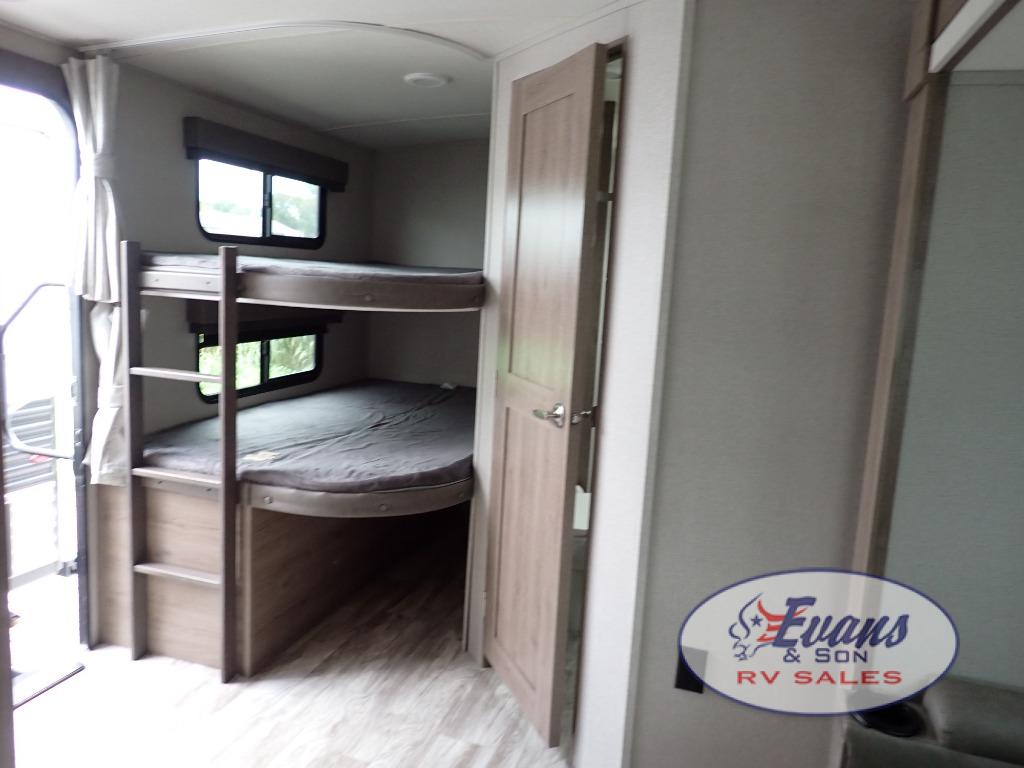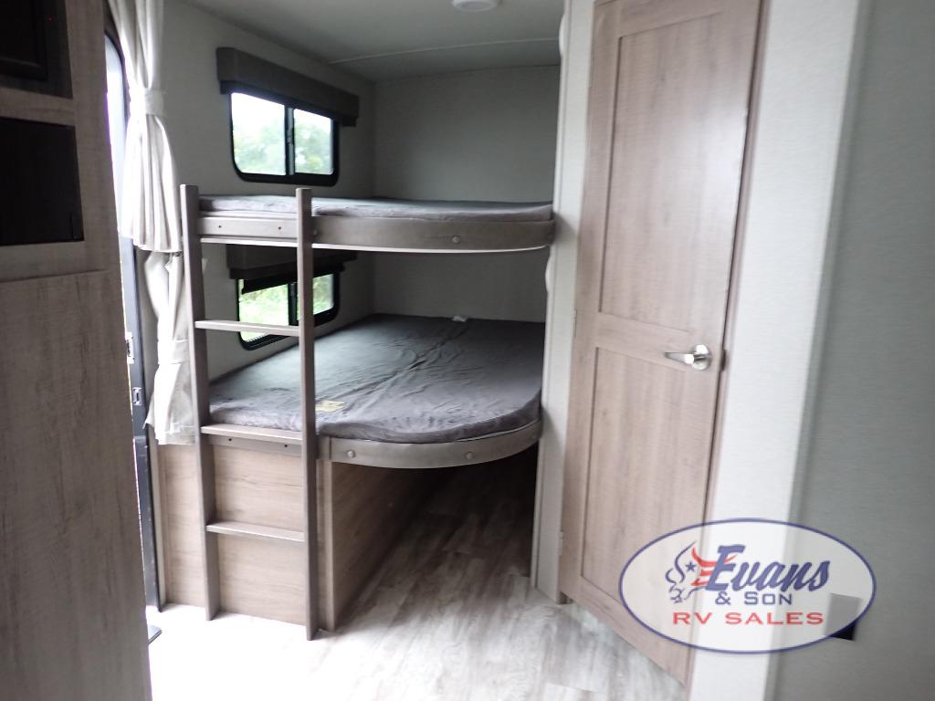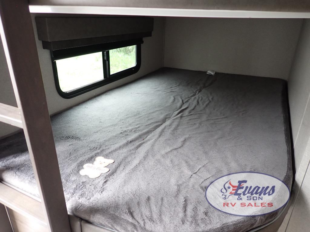 You can daydream about camping but all you need to do is walk inside this travel trailer to see how the floorplan fits your family. You will find bedding for six on the queen bed and bunk beds, plus two more if you fold down the U-shaped dinette. The chef in the family gets to choose to cook inside with full amenities, or outdoors on the outside kitchen. The kiddos will have their very own space on the double size bunk beds after the bikes have been removed. There is a 32" LED TV with swing arm, shoe storage, and much more to enjoy!