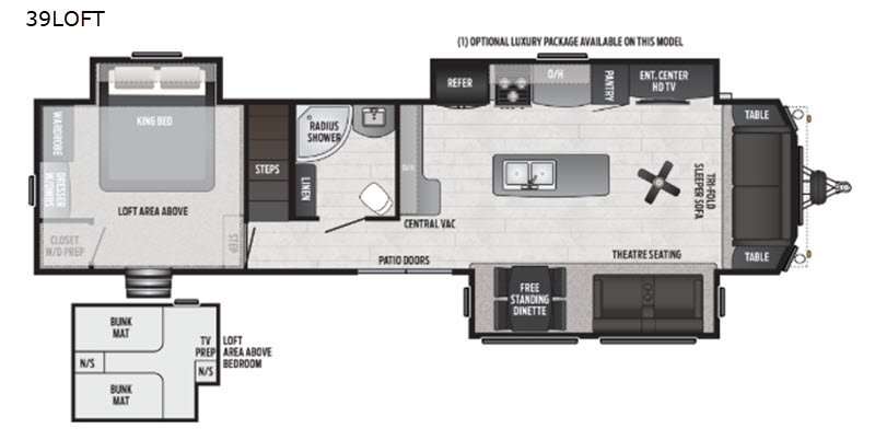 This Retreat destination trailer by Keystone RV brings you the feel of home all while you enjoy your camping experience. Your kids will love the loft, a place to call their own. There are two bunk mats and a place for a TV to be hooked up. There is also a central vacuum system that will help to keep this unit spic and span. Enjoy the private bedroom fit for a king with its king-size bed or relax with the family on the theatre seating in front of the 50" LED TV.
