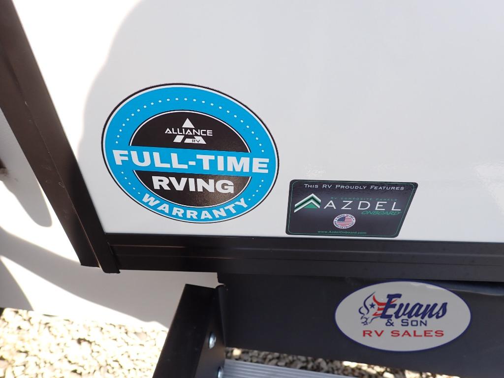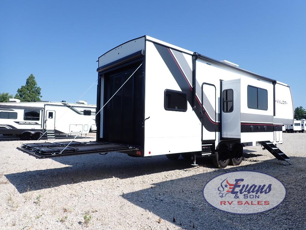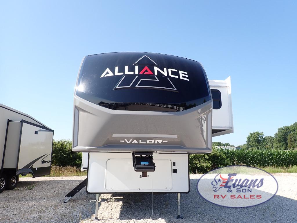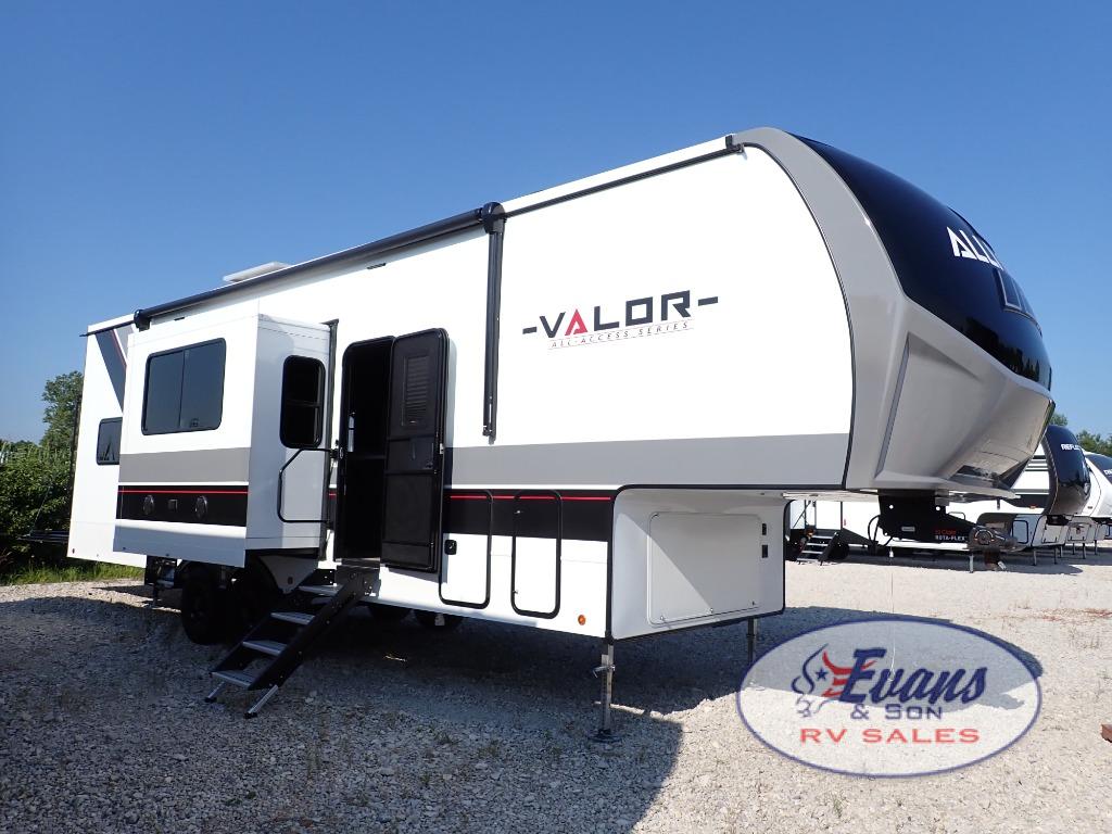 With any Valor All-Access toy hauler by Alliance RV you will be getting a travel trailer or fifth wheel with exceptional features at a great value! There is a painted fiberglass front cap, Mylar reinforced exterior seals, Azdel-backed fiberglass sidewalls, and a walk-on roof with a seamless PVC roof covering for added strength and durability. The 101" wide-body Benchmark chassis means you can bring along your larger toys, and the multipoint tie-down system will keep your toys safe and secure on the way to the campground. All of your power needs will be met with the Masters of 12 Volt Package that includes a 12V JBL sound system and USB charging stations throughout, plus the Off The Grid Pack comes with a 400 watt solar panel, 40 amp charge controller, and generator prep to keep you going all week long. Some of the interior comforts you'll enjoy are commercial grade vinyl flooring with no carpet so you can easily clean up, black cabinetry hardware, residential LED recessed ceiling lights, and so much more!