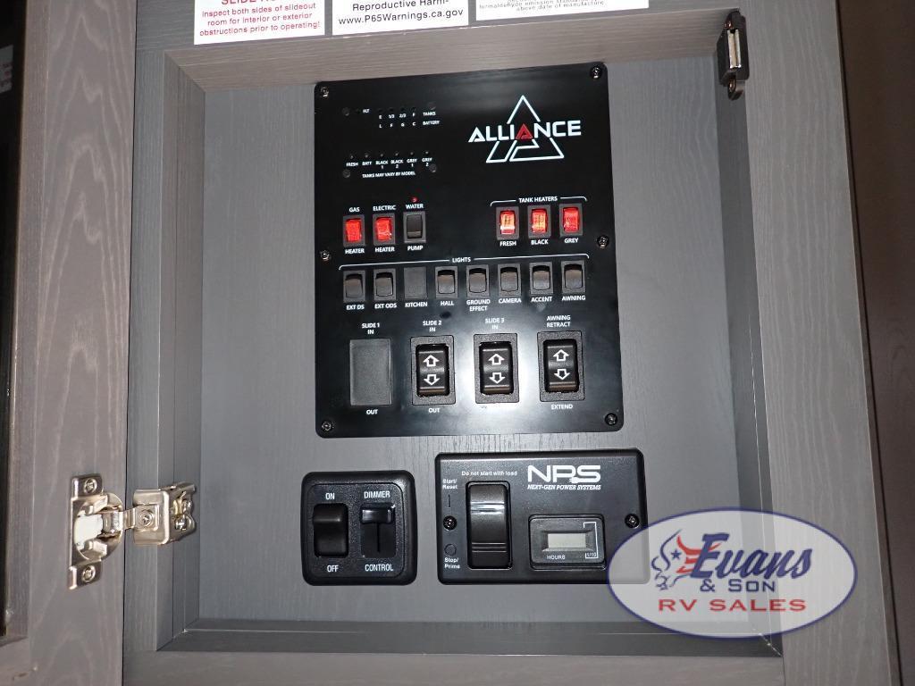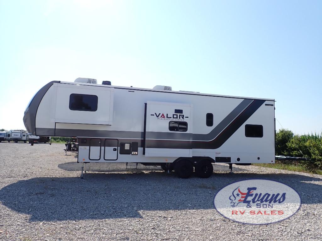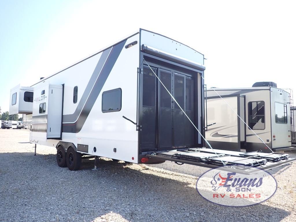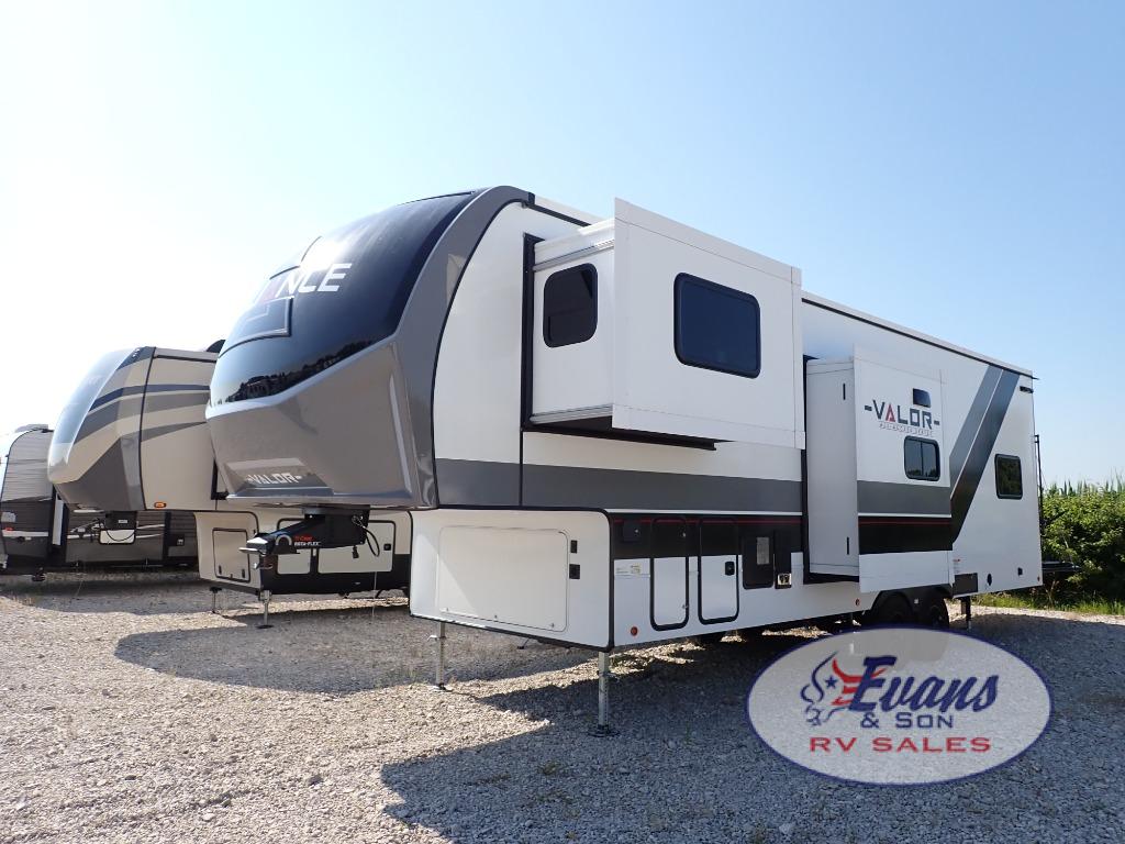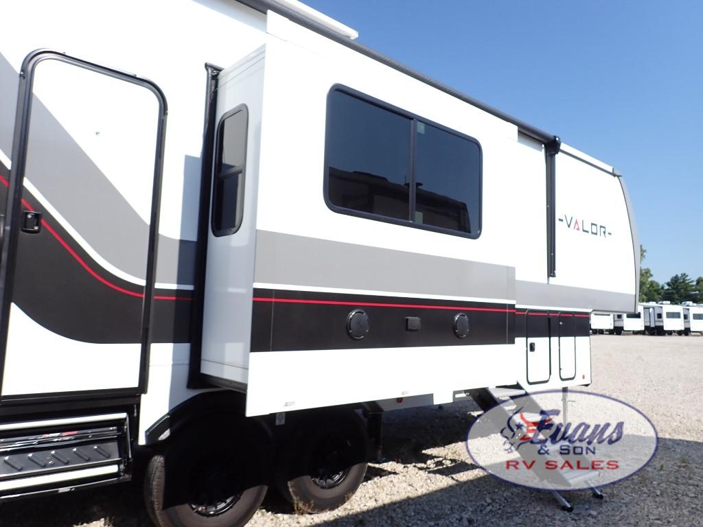 With any Valor All-Access toy hauler by Alliance RV you will be getting a travel trailer or fifth wheel with exceptional features at a great value! There is a painted fiberglass front cap, Mylar reinforced exterior seals, Azdel-backed fiberglass sidewalls, and a walk-on roof with a seamless PVC roof covering for added strength and durability. The 101" wide-body Benchmark chassis means you can bring along your larger toys, and the multipoint tie-down system will keep your toys safe and secure on the way to the campground. All of your power needs will be met with the Masters of 12 Volt Package that includes a 12V JBL sound system and USB charging stations throughout, plus the Off The Grid Pack comes with a 400 watt solar panel, 40 amp charge controller, and generator prep to keep you going all week long. Some of the interior comforts you'll enjoy are commercial grade vinyl flooring with no carpet so you can easily clean up, black cabinetry hardware, residential LED recessed ceiling lights, and so much more!